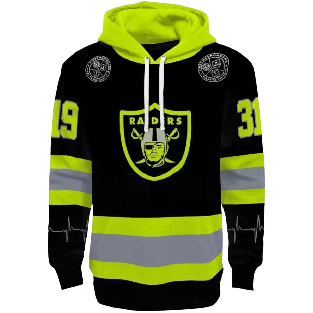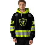 Show off your team spirit with our Personalized Las Vegas Raiders Safety Motif Black Neon Green All-Over Print Hoodie. Perfect for die-hard fans, this hoodie is designed for both men and women who want to showcase their love for the Raiders while staying comfortable and stylish. Whether you’re heading to a game or just hanging out with friends, this hoodie is a unique addition to your casual wardrobe.
