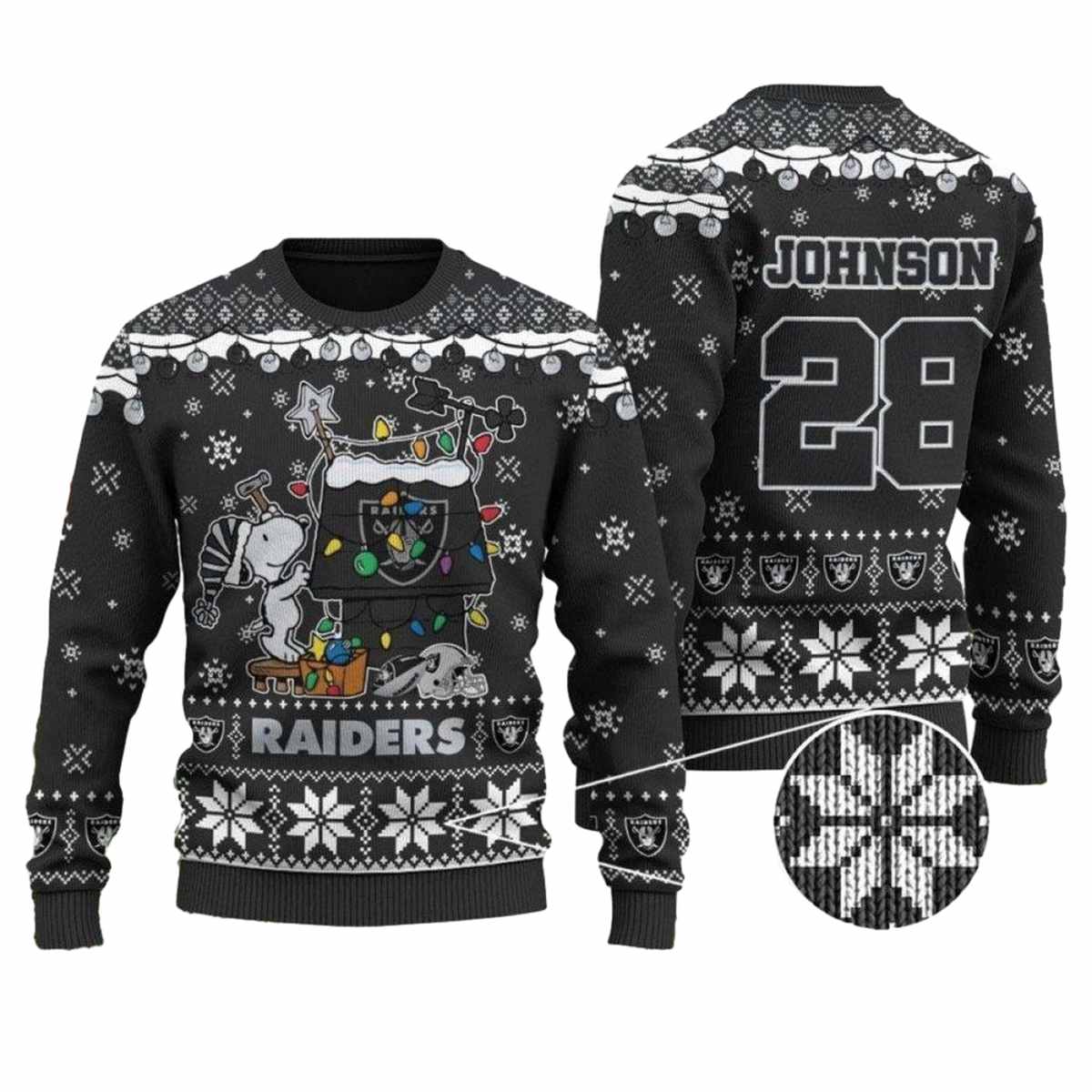 Get ready to celebrate the spirit of the season with our Personalized Las Vegas Raiders Snoopy House Ugly Sweater! Perfect for die-hard fans and anyone looking to add a playful twist to their winter wardrobe, this cozy sweater is a must-have for holiday parties, game days, or just lounging at home with family and friends. Its unique design combines the beloved Snoopy with your favorite team’s colors for a look that’s both festive and fun!
