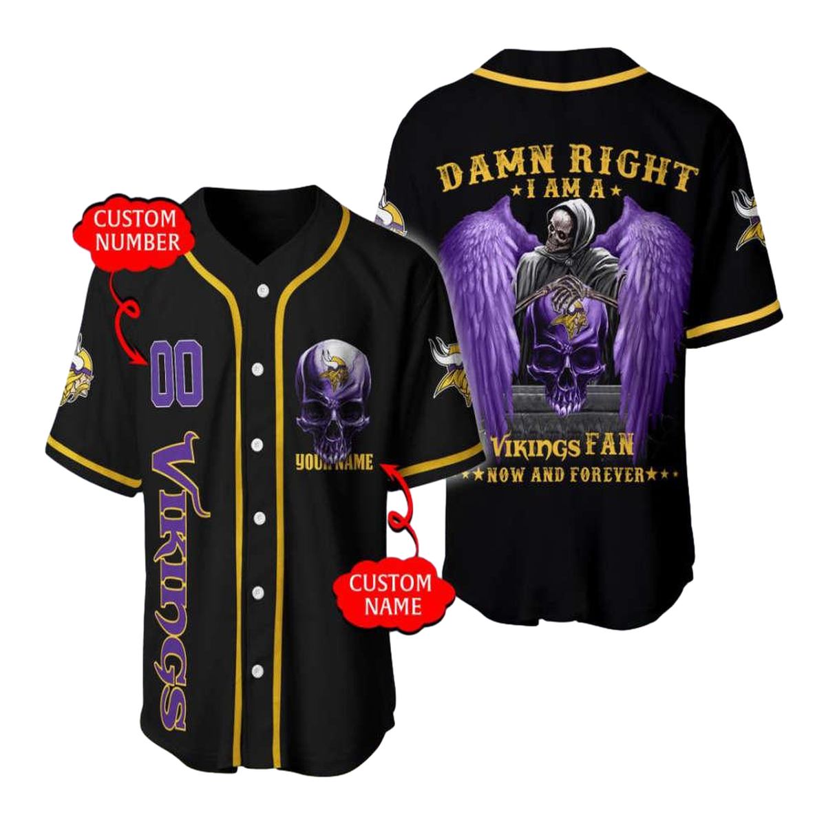 Get ready to show off your team pride with our Personalized Minnesota Vikings DAMN RIGHT I Am A Vikings Fan Baseball Jersey. Perfect for game day or casual outings, this jersey combines sporty style with a bold statement, making it an essential addition to any fan’s wardrobe.