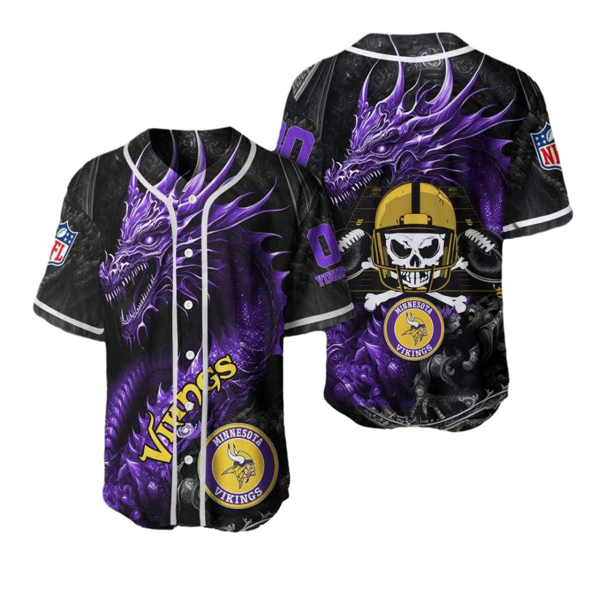 Elevate your game day experience with our Personalized Minnesota Vikings Logo And Dragon Purple Baseball Jersey! Perfect for athletes and fans alike, this jersey combines sporty style with a unique flair, making it ideal for sporting events, casual outings, or creating a standout team uniform.