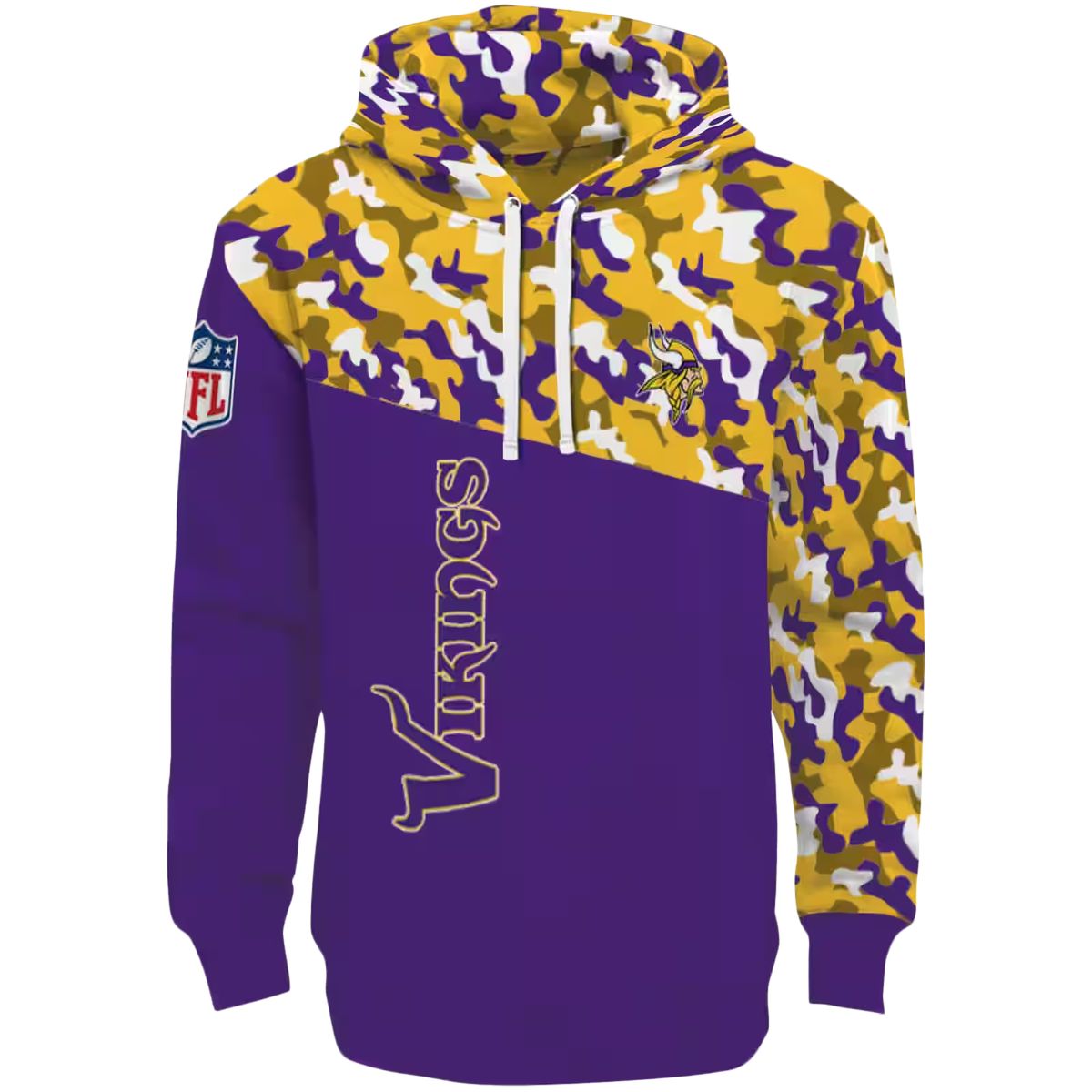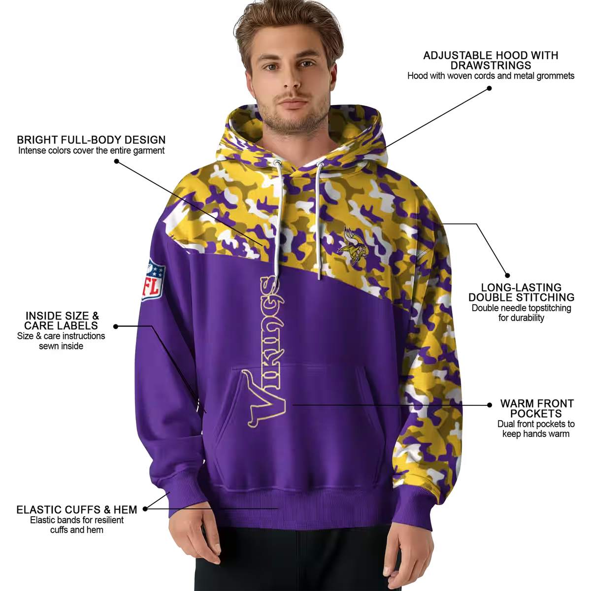 Embrace your team spirit with our Personalized Minnesota Vikings Logo Camo And Purple Pattern AOP Hoodie, designed for fans who want to showcase their loyalty in style. Perfect for casual outings or game days, this hoodie combines a unique all-over print with a comfortable and relaxed fit, ensuring you look great while cheering for your favorite team.