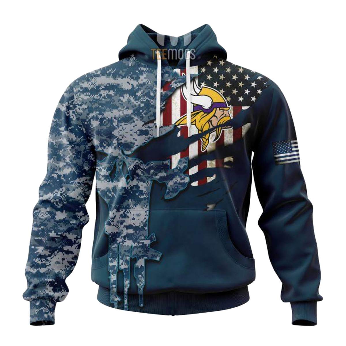 Show your pride for the Minnesota Vikings with our Personalized Minnesota Vikings Navy Skull Camo Veteran AOP Hoodie. Designed for fans who appreciate both style and comfort, this unique hoodie is perfect for daily wear or casual outdoor activities during the cooler winter months. Its all-over graphic print and relaxed fit make it a standout piece that embodies team spirit while keeping you cozy.