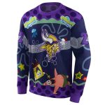 Embrace your fandom with our Personalized Minnesota Vikings Patrick Star Purple Navy AOP Sweatshirt, designed for true enthusiasts. Perfect for game day, casual outings, or just lounging at home, this sweatshirt combines comfort and style, ensuring you stand out from the crowd. With a unique all-over print that captures the spirit of the Minnesota Vikings and the playful charm of Patrick Star, it’s a must-have for any fan looking to showcase their team pride.