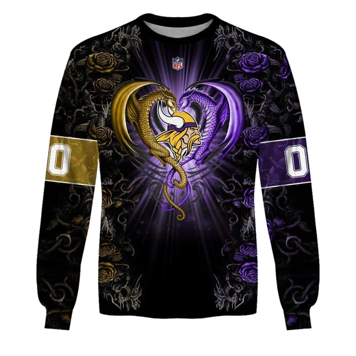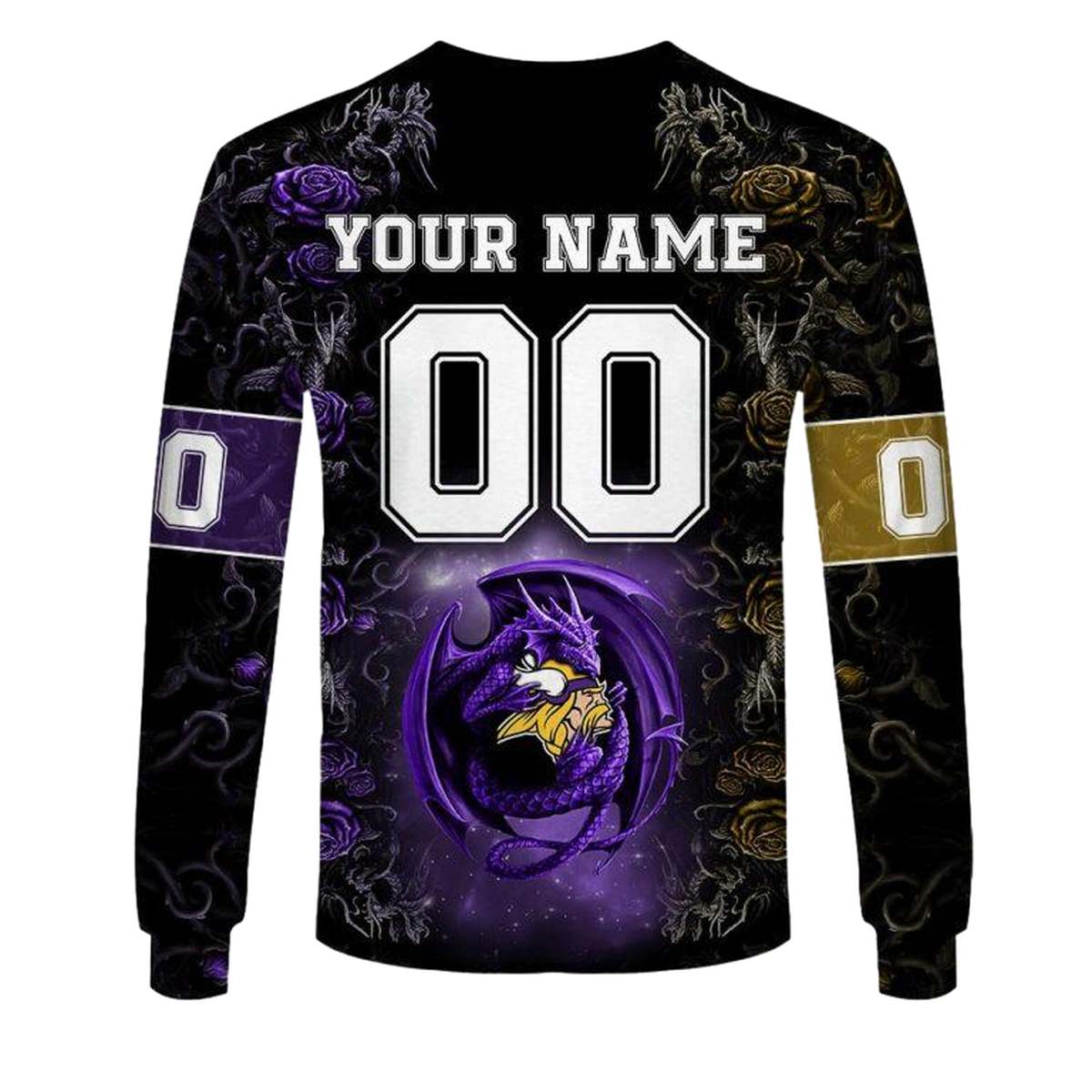 Elevate your streetwear game with the Personalized Minnesota Vikings Rose Dragon AOP Sweatshirt, designed for fans who appreciate unique style and comfort. This sweatshirt is perfect for casual outings, lounging at home, or hitting the gym, making it a versatile addition to any wardrobe. With its striking all-over print, it stands out as a bold expression of your team spirit and individuality.