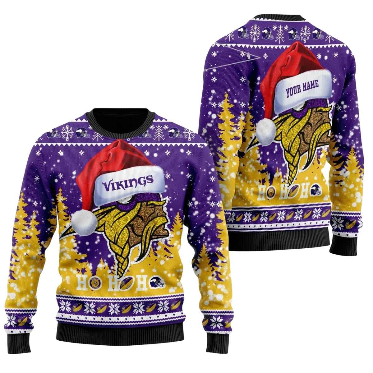Get ready to jingle all the way in our Personalized Minnesota Vikings Symbol Wearing Santa Claus Hat Ho Ho Ho Ugly Sweater! This festive piece is perfect for die-hard Vikings fans and anyone looking to spread some holiday cheer. Whether you’re attending a holiday party, lounging at home, or hitting the tailgate, this sweater brings a fun twist to your winter wardrobe with its playful design and cozy fit.