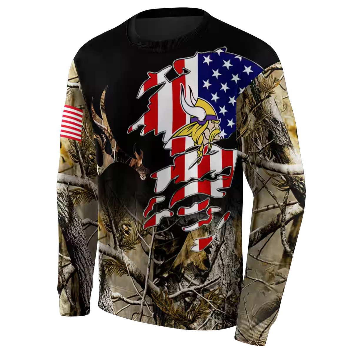 Celebrate your love for the Minnesota Vikings with our Personalized Minnesota Vikings US Flag Tree Camo AOP Sweatshirt. This eye-catching piece is perfect for passionate fans and streetwear enthusiasts alike, making it a must-have for casual outings, game days, or just lounging at home. The unique all-over print design adds a modern twist to a classic favorite, ensuring you stand out while showcasing your team spirit.