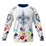 Show your support with our Personalized New Orleans Saints Autism Awareness Hands AOP Sweatshirt, designed for those who celebrate individuality and community spirit. Perfect for fans of all ages, this sweatshirt is ideal for casual outings, game days, or simply lounging at home while making a statement. Its unique all-over print showcases your passion for both the team and a meaningful cause, setting you apart in style.
