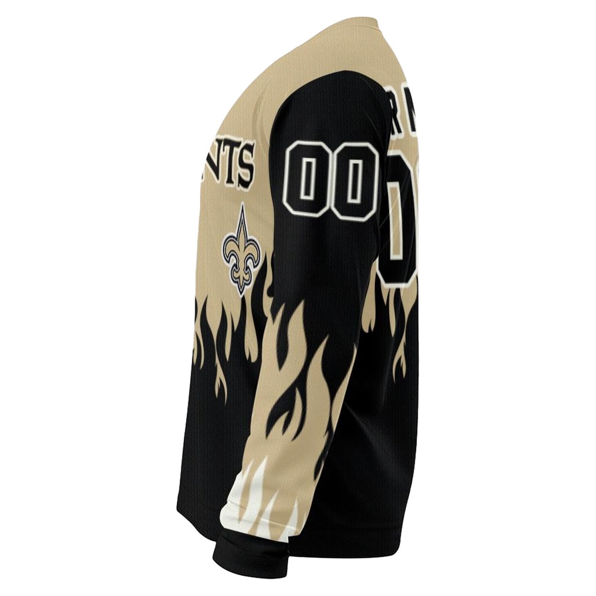 Elevate your streetwear game with our Personalized New Orleans Saints Flame Outline Gold Black AOP Sweatshirt. Designed for true fans, this sweatshirt is perfect for game days, casual outings, or simply lounging in style. With its eye-catching all-over print and modern relaxed fit, it’s the ultimate blend of comfort and fan pride.