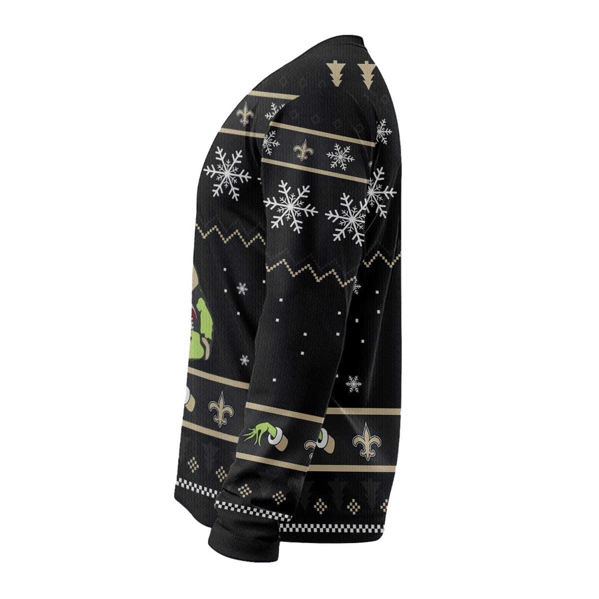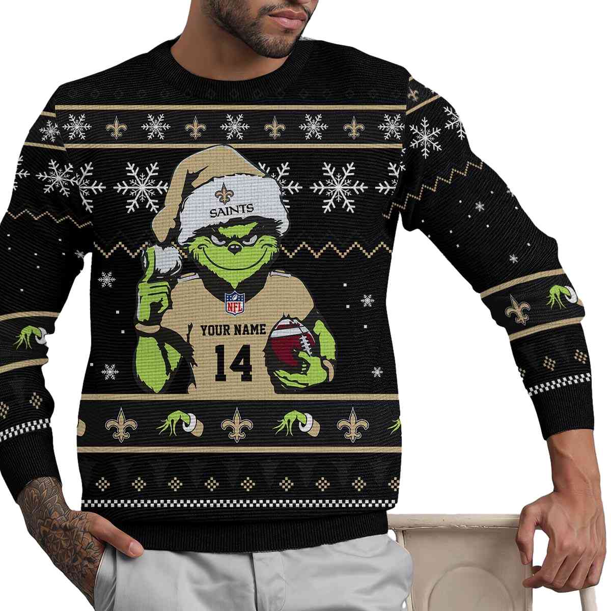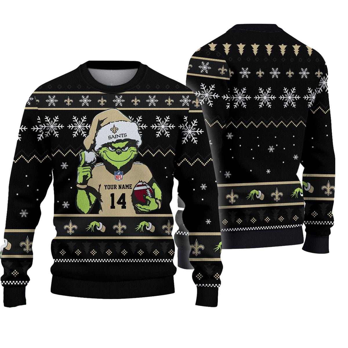 Get ready to jingle all the way to your next holiday gathering with our Personalized New Orleans Saints Grinch Christmas Touchdown Black Ugly Sweater! This festive piece is perfect for die-hard Saints fans and lovers of all things merry. Whether you’re at a holiday party, cozying up at home, or cheering from the stands, this sweater adds a touch of whimsical flair and team spirit that’s sure to turn heads and spark smiles.