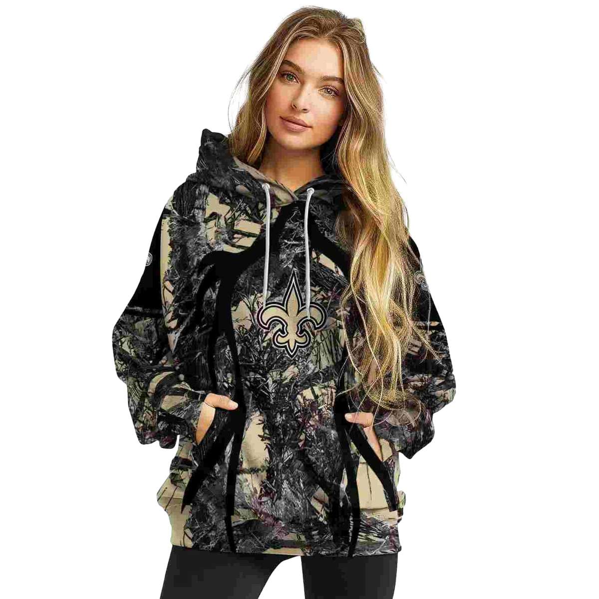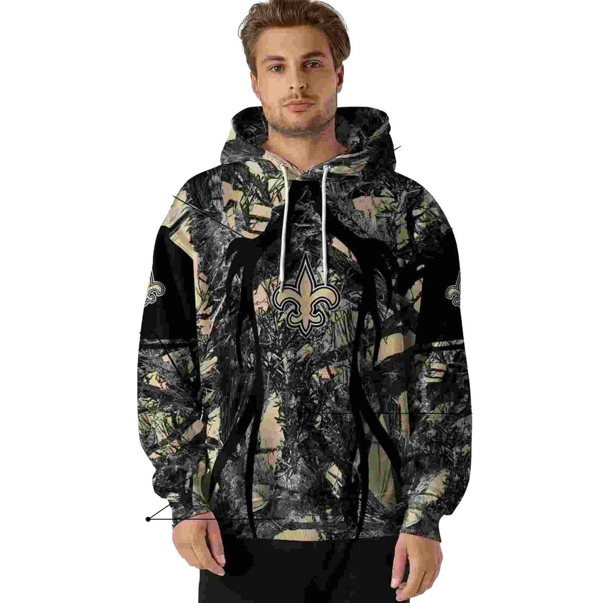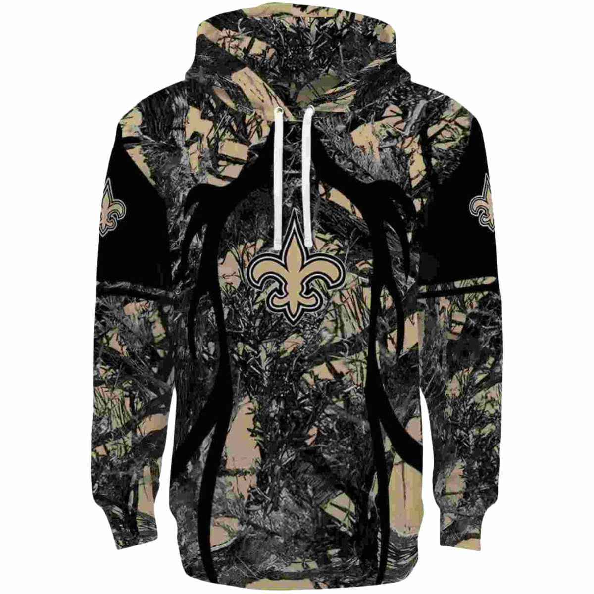 Introducing the Personalized New Orleans Saints Hunting Theme Gold Black All-Over Hoodie, a must-have for passionate fans who love to showcase their team spirit in style. Perfect for both men and women, this hoodie seamlessly blends comfort and fashion, making it ideal for daily wear or casual outdoor activities during the cooler months. Stand out in any crowd with its unique design that celebrates your love for the Saints while keeping you cozy.
