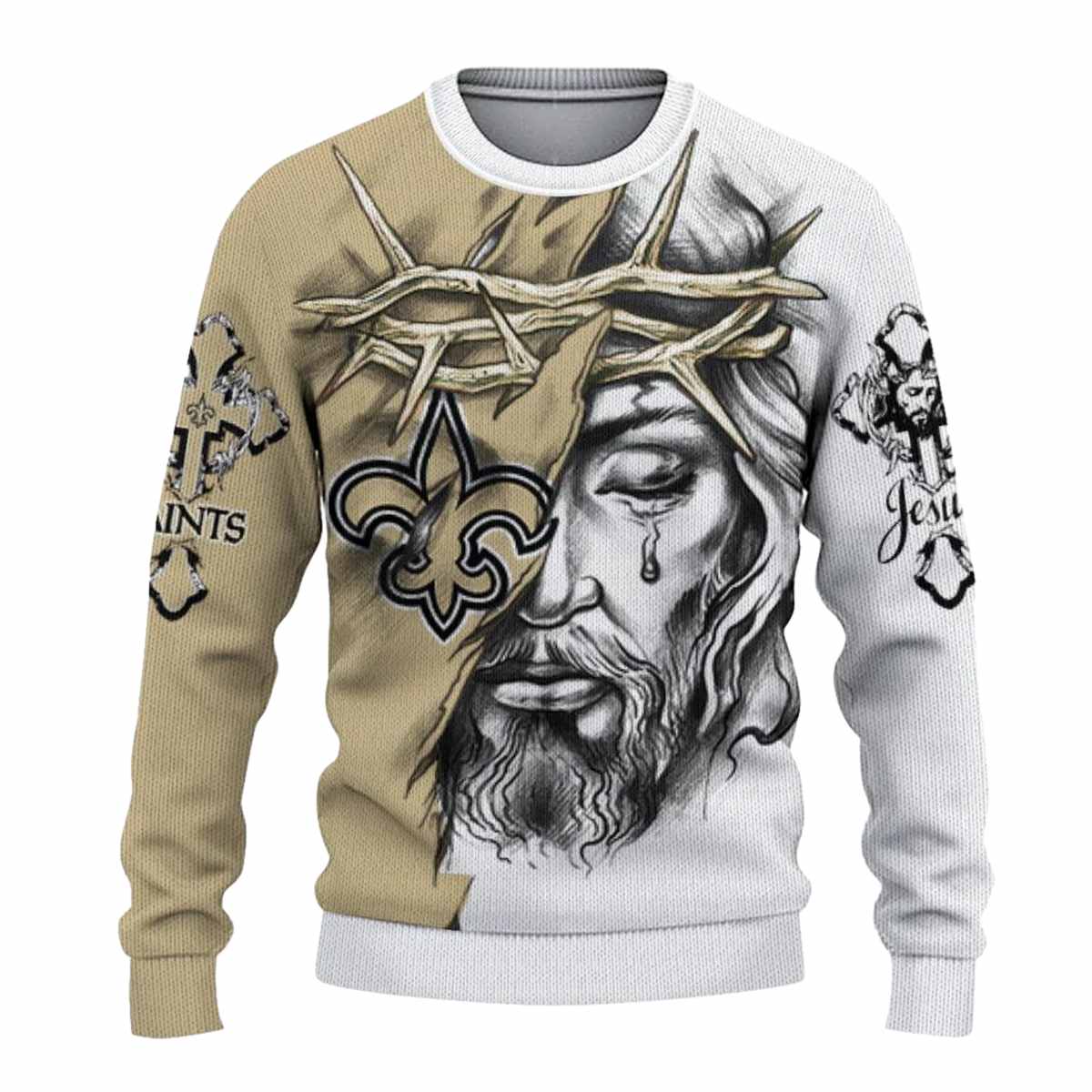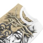 Celebrate your love for the New Orleans Saints with this unique Personalized Jesus Tears Gold White All-Over Printed Sweatshirt. Perfect for die-hard fans and casual wearers alike, this sweatshirt is designed for cozy comfort during game day, casual outings, or lounging at home. Its eye-catching design not only showcases your team spirit but also adds a modern twist to your streetwear collection.