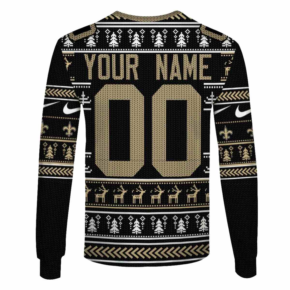 Embrace your love for the New Orleans Saints and the festive season with our Personalized New Orleans Saints Logo And Christmas Pattern Black AOP Sweatshirt. Perfect for die-hard fans and holiday enthusiasts alike, this unique sweatshirt is ideal for game days, cozy gatherings, or simply lounging at home. Its all-over print design adds a modern twist, ensuring you stand out while celebrating your favorite team.