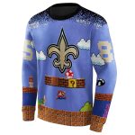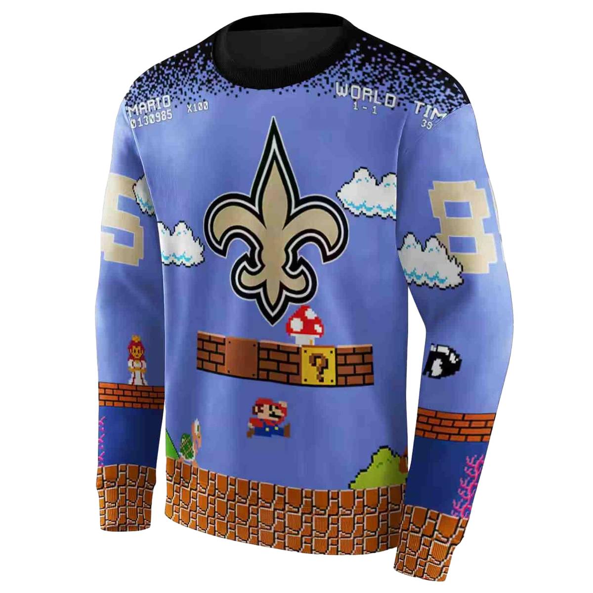 Embrace your love for both the New Orleans Saints and classic gaming with our Personalized New Orleans Saints Logo and Mario Blue Black All-Over Printed Sweatshirt. Perfect for fans and gamers alike, this stylish piece is designed for casual outings, lounging at home, or showing off your team spirit at the game. With its unique design, it stands out while keeping you cozy and comfortable.