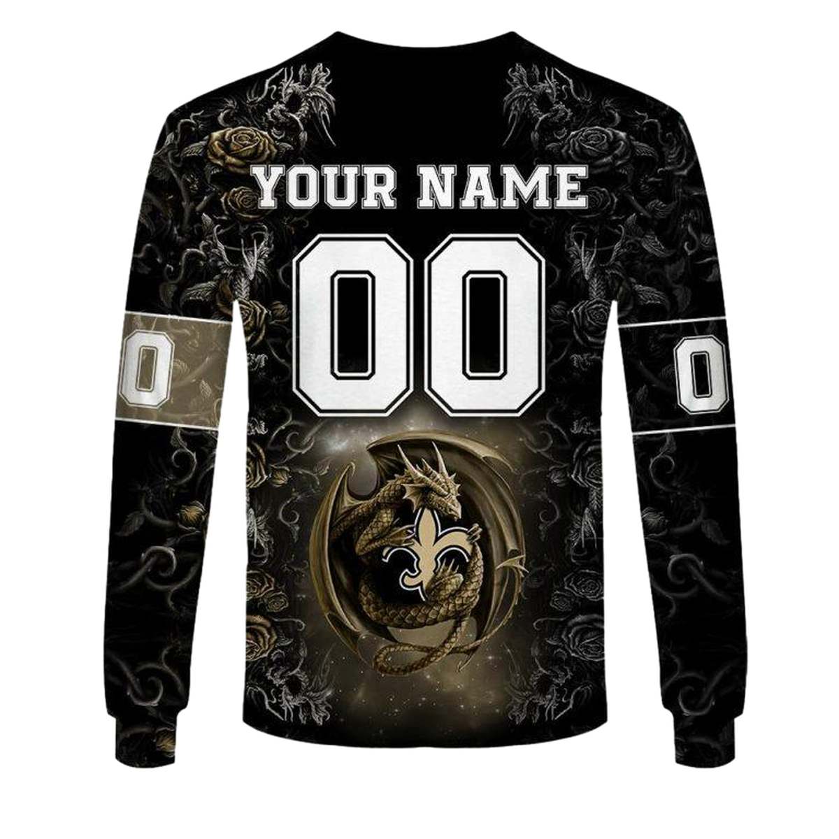 Introducing the Personalized New Orleans Saints Rose Dragon AOP Sweatshirt, a perfect blend of style and comfort for any die-hard Saints fan. This sweatshirt is ideal for casual outings, game days, or cozy lounging at home. Its unique all-over print featuring the fierce rose dragon motif sets you apart in the crowd while showcasing your team spirit.