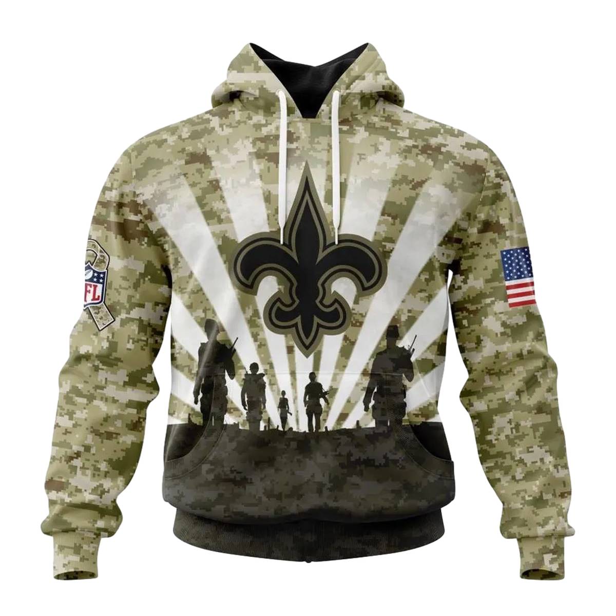 Show your unwavering support for the New Orleans Saints and honor our veterans with this unique all-over printed hoodie. Perfect for die-hard fans and those who appreciate style and comfort, this hoodie is designed for casual outings, game days, or simply lounging at home. Its standout design and cozy feel make it a must-have for anyone looking to celebrate their team and express their patriotism.