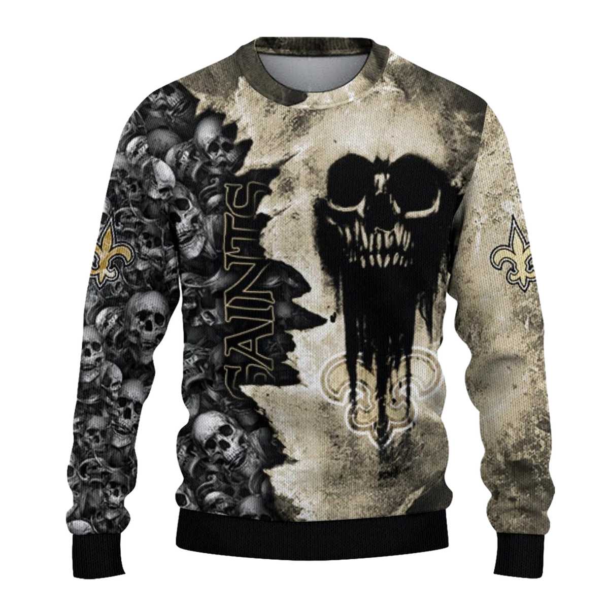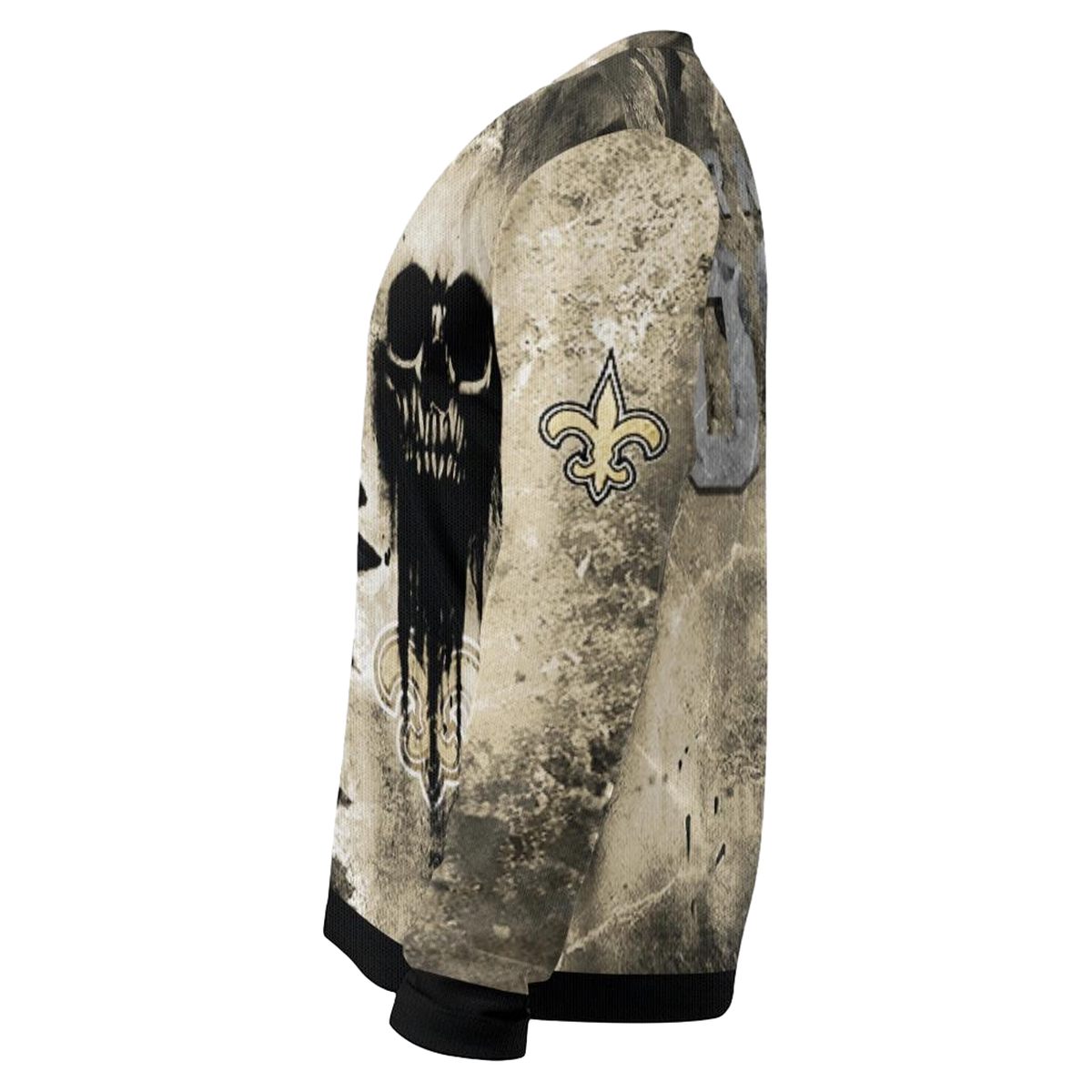 Elevate your streetwear game with our Personalized New Orleans Saints Skull Collage Gold AOP Sweatshirt. Perfect for die-hard fans and street style enthusiasts alike, this sweatshirt is designed for casual outings, lounging at home, or hitting the gym. Its unique all-over print combines comfort with a bold statement, making it a standout piece in any wardrobe.