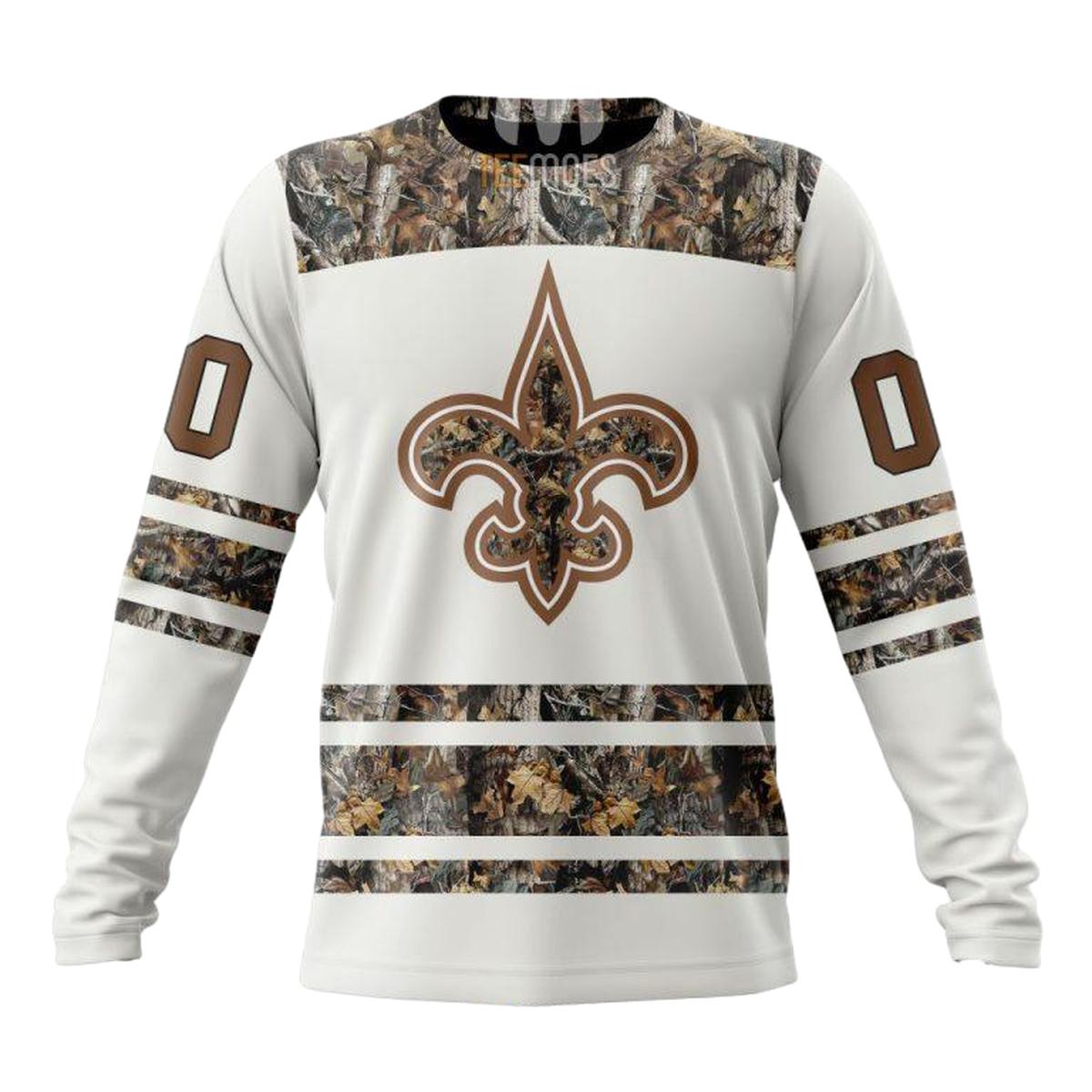 Elevate your streetwear game with our Personalized New Orleans Saints White Camo Hunting AOP Sweatshirt. Designed for fans and fashion enthusiasts alike, this cozy piece is perfect for casual outings, game days, or simply lounging around. Its unique all-over print combines team spirit with a modern camo twist, ensuring you stand out while showcasing your love for the Saints.