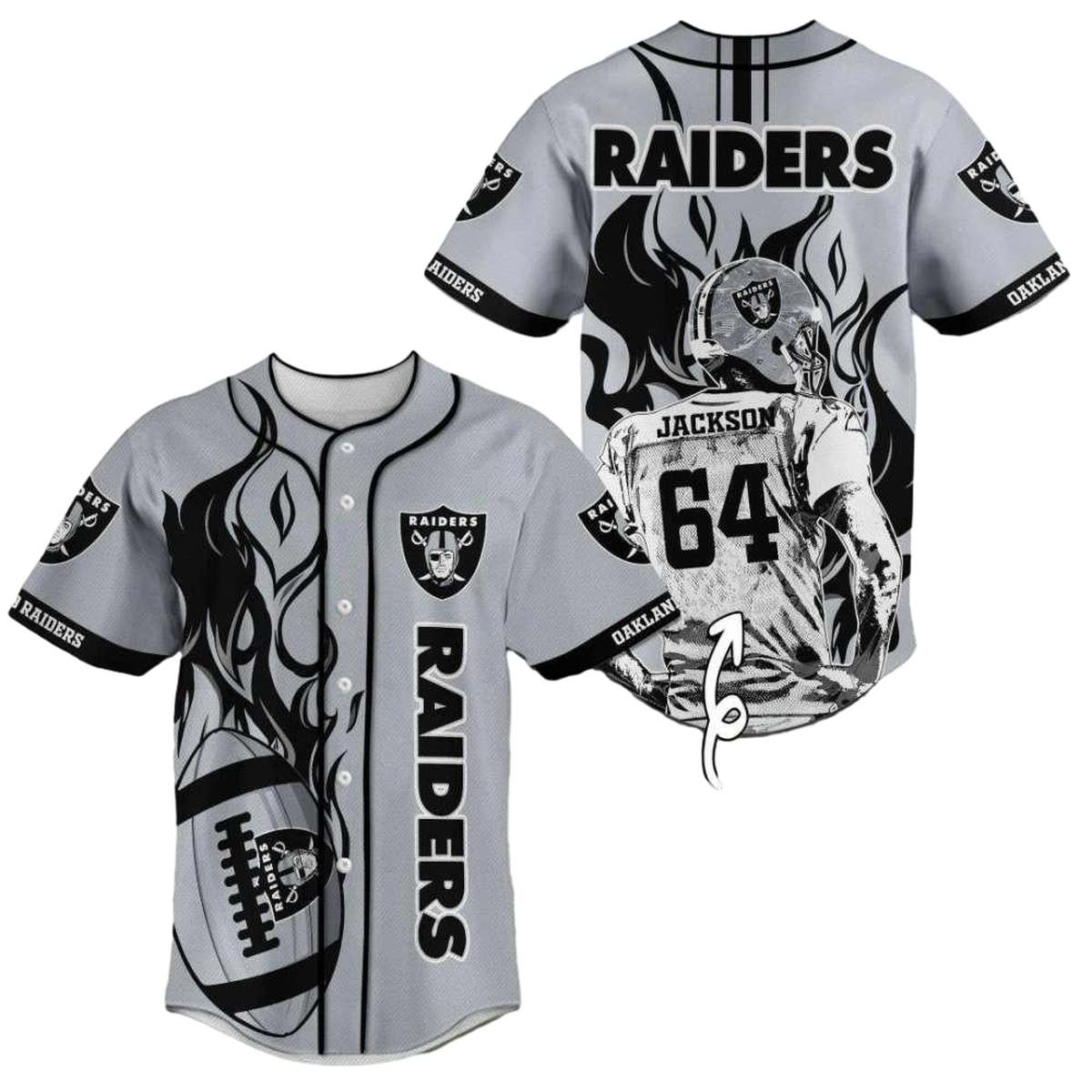Elevate your game day look with our Personalized Oakland Raiders Logo Ball Flame Baseball Jersey. Perfect for athletes and fans alike, this custom all-over printed jersey is designed to help you stand out on the field or in the stands. Whether you’re cheering for your team or just enjoying a casual day out, this jersey combines sporty style with ultimate comfort.
