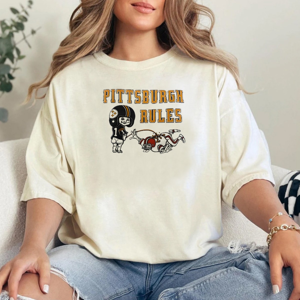 Show your team spirit with the Pittsburgh Rules Steelers Peeing Cleveland Browns T-Shirt! This fan-made design is perfect for die-hard Steelers supporters who love to showcase their loyalty in a fun and lighthearted way. Ideal for casual outings, themed events, or just lounging around, this t-shirt combines comfort with a bold statement that’s sure to turn heads. Made in the USA, it’s a must-have for any Steelers fan looking to add a unique piece to their wardrobe.