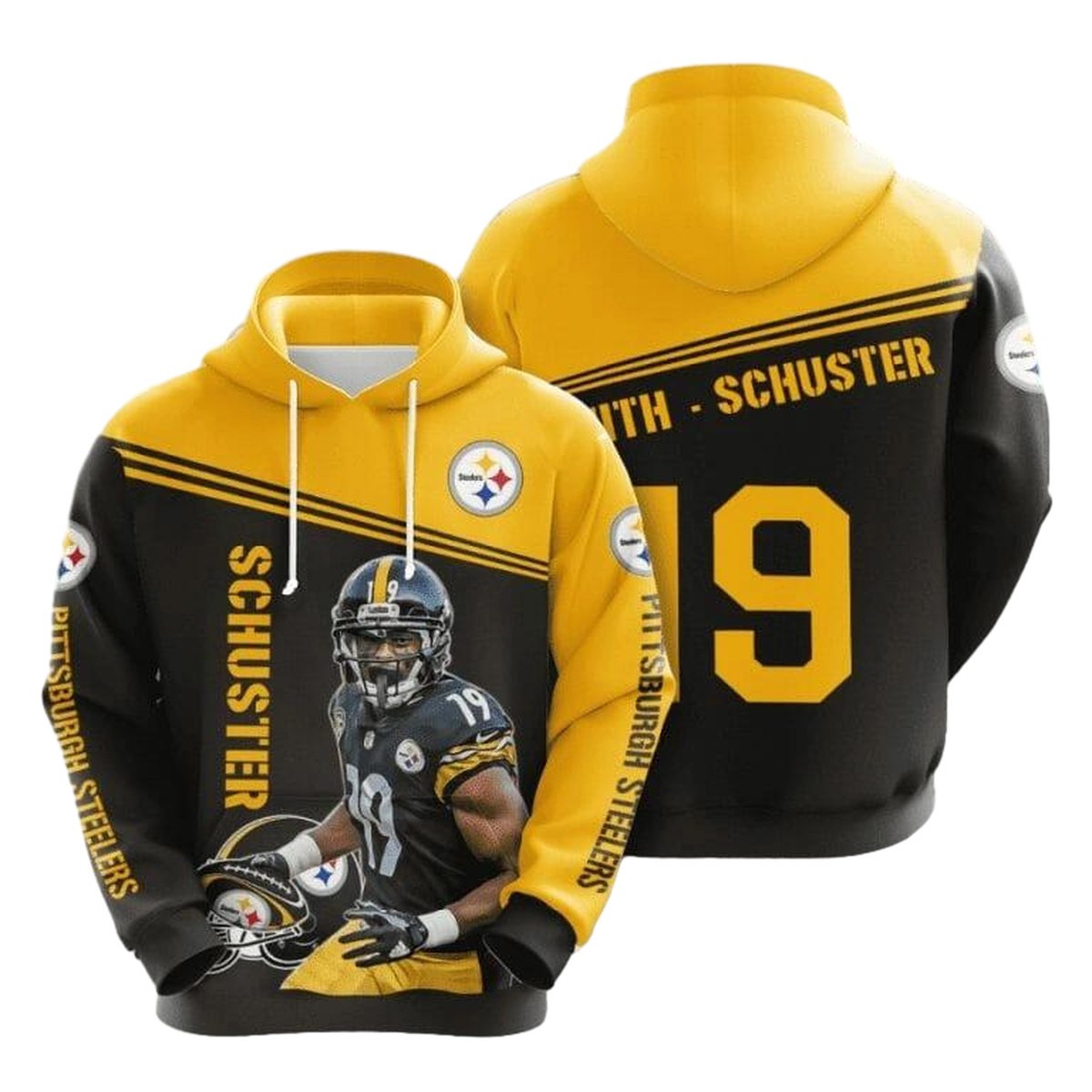Show your support for the Pittsburgh Steelers with our JuJu Smith Schuster Black Gold All-Over Print Hoodie. Perfect for fans of all ages, this hoodie is ideal for daily wear or casual outings, especially during the cooler months. Its unique all-over design showcases your team pride while providing a comfortable and relaxed fit for both men and women.