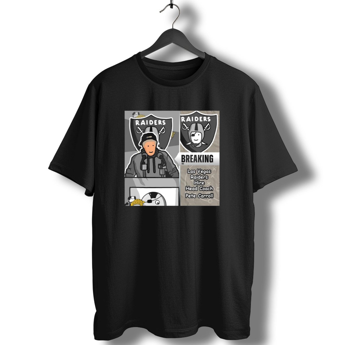 Show your unwavering support for the Las Vegas Raiders with our exclusive “Raiders Breaking News” T-shirt! This fan-made design celebrates the exciting announcement of Pete Carroll as the new head coach, making it a must-have for every true Raiders enthusiast. Perfect for casual outings, themed events, or simply displaying your team spirit on a daily basis, this shirt is a standout choice for any football fan looking to make a statement.