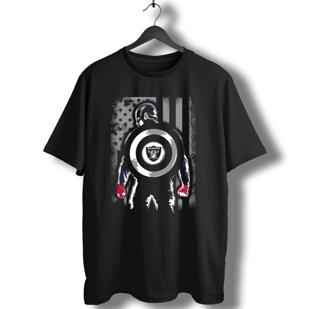 Show your patriotic spirit and love for heroism with our Raiders Captain America Shield American Flag T-Shirt! Perfect for die-hard fans and casual wearers alike, this shirt combines iconic imagery with a comfortable fit, making it an excellent choice for themed events, casual outings, or just lounging at home. The unique fan-made design is proudly printed in the USA, ensuring you stand out while celebrating your favorite superhero.