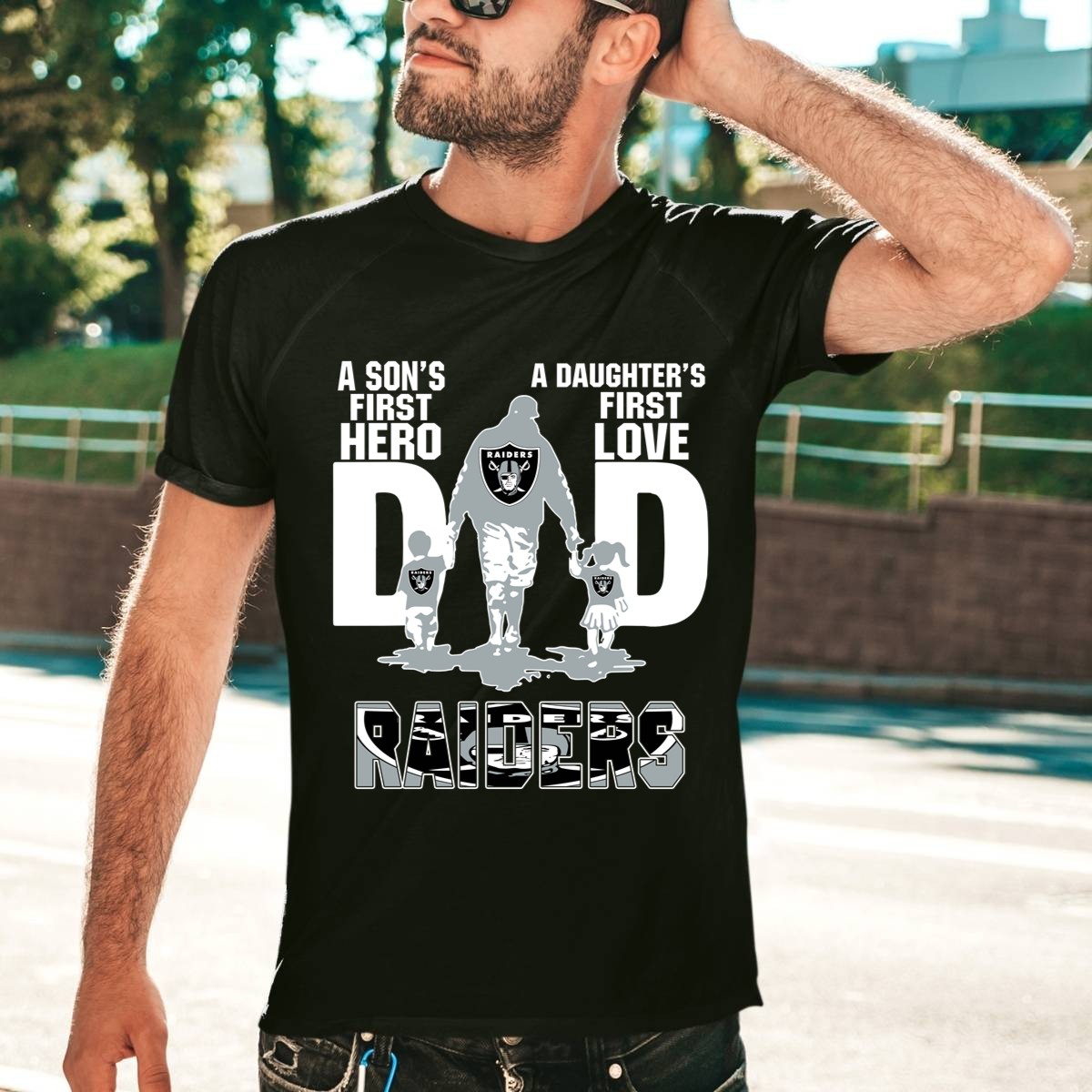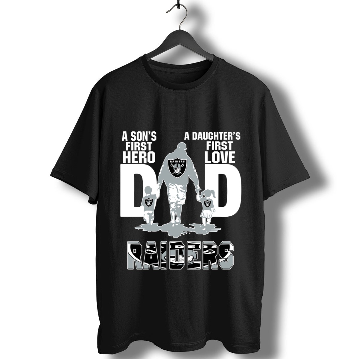 Celebrate the unbreakable bond between fathers and their children with our “Raiders Dad: A Son’s First Hero, A Daughter’s First Love” T-shirt. This fan-made design is perfect for proud dads who want to showcase their love and dedication to their kids. Whether you’re at a casual family gathering, a themed event, or just enjoying daily wear, this classic tee serves as a heartfelt tribute to fatherhood, making it an ideal gift for any occasion. Plus, it’s printed right here in the USA, ensuring top-notch quality and a unique touch!