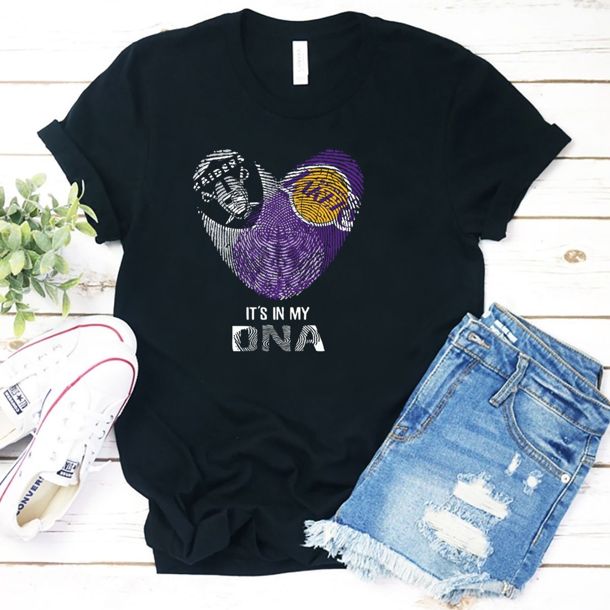 Show off your undeniable team spirit with our Raiders Lakers Its In My DNA Fingerprint Logo Combination T-Shirt! This unique fan-made design is perfect for die-hard supporters of both teams, making it an ideal choice for casual outings, themed events, or just lounging around. Crafted for comfort and style, this shirt is a must-have for anyone looking to celebrate their love for the Raiders and Lakers while standing out from the crowd.