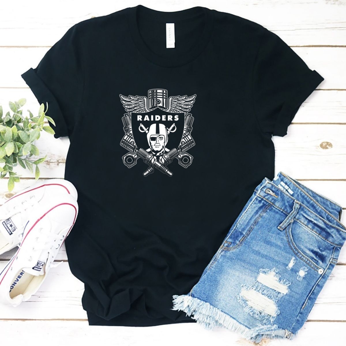 Rev up your style with our Raiders Motorcycle Skull Pistons Winged T-Shirt, an essential for motorbike enthusiasts and casual wear lovers alike. This graphic tee captures the spirit of freedom and adventure, making it perfect for themed events, casual outings, or just a laid-back day. With its unique fan-made design printed in the USA, this shirt not only showcases your passion for motorcycles but also stands out in any crowd.