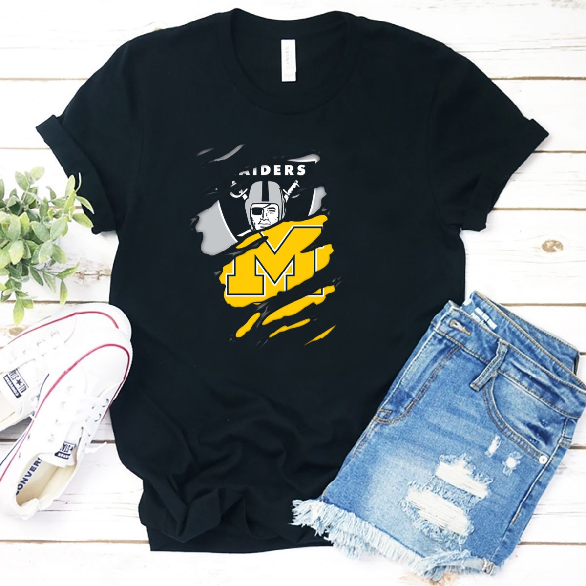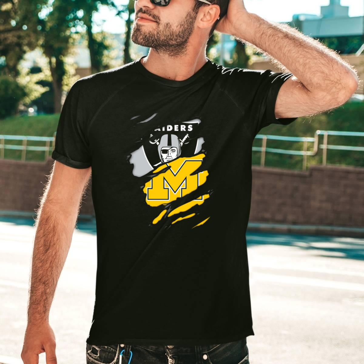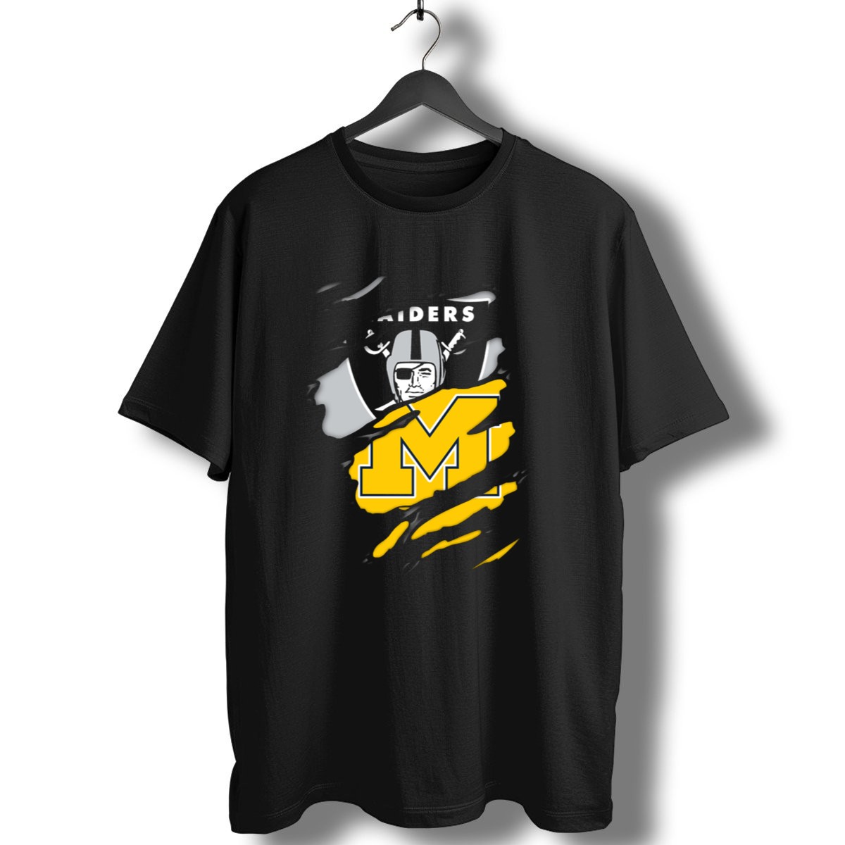 Show your unwavering support for the Raiders with our Raiders Oakland Helmet With Michigan Block M Fusion T-Shirt. This fan-made design is perfect for die-hard fans and casual wear enthusiasts alike. Whether you’re heading to a game, a themed event, or just hanging out with friends, this shirt adds a bold touch to your wardrobe while showcasing your team spirit. Printed in the USA, it combines comfort and style, making it a must-have for any sports lover.