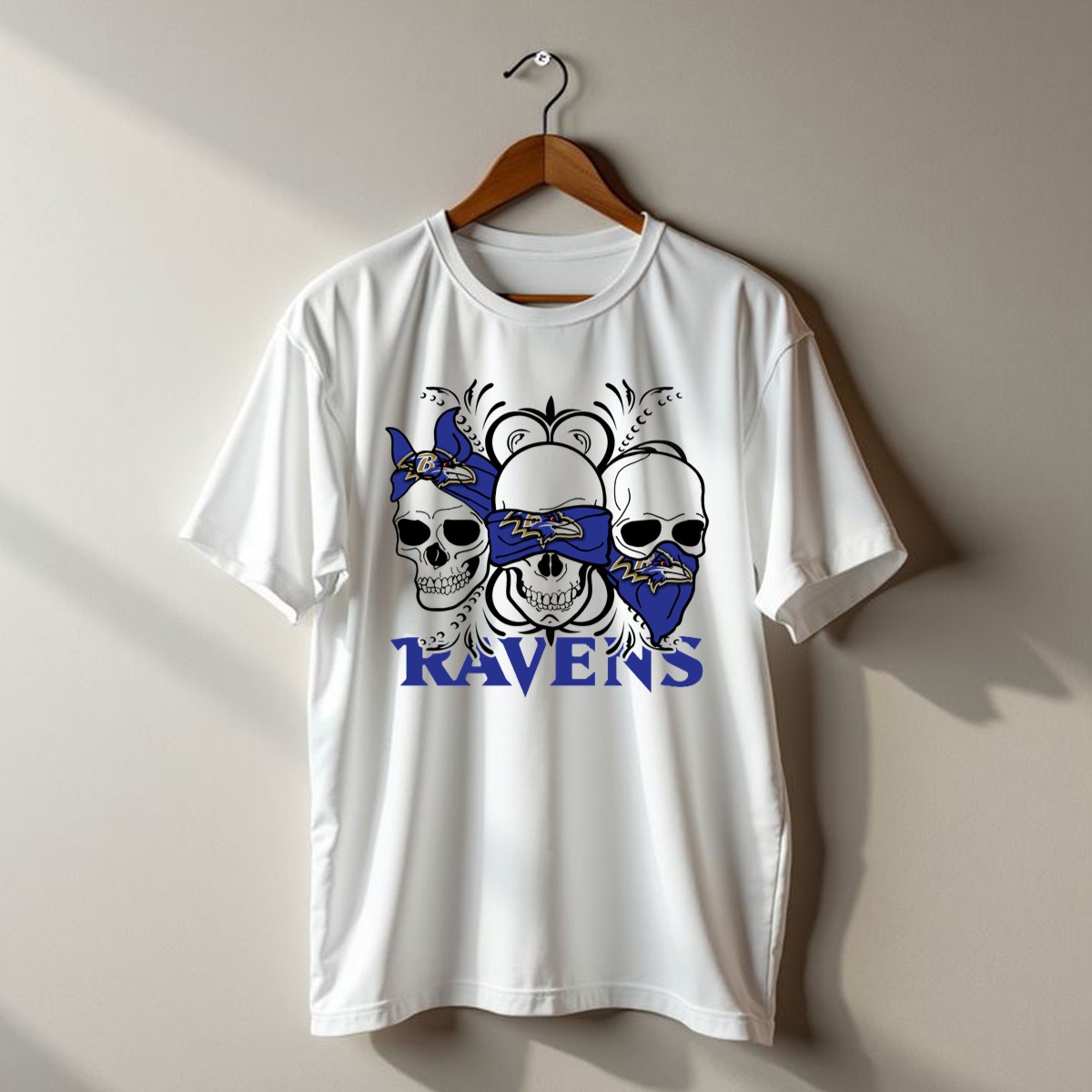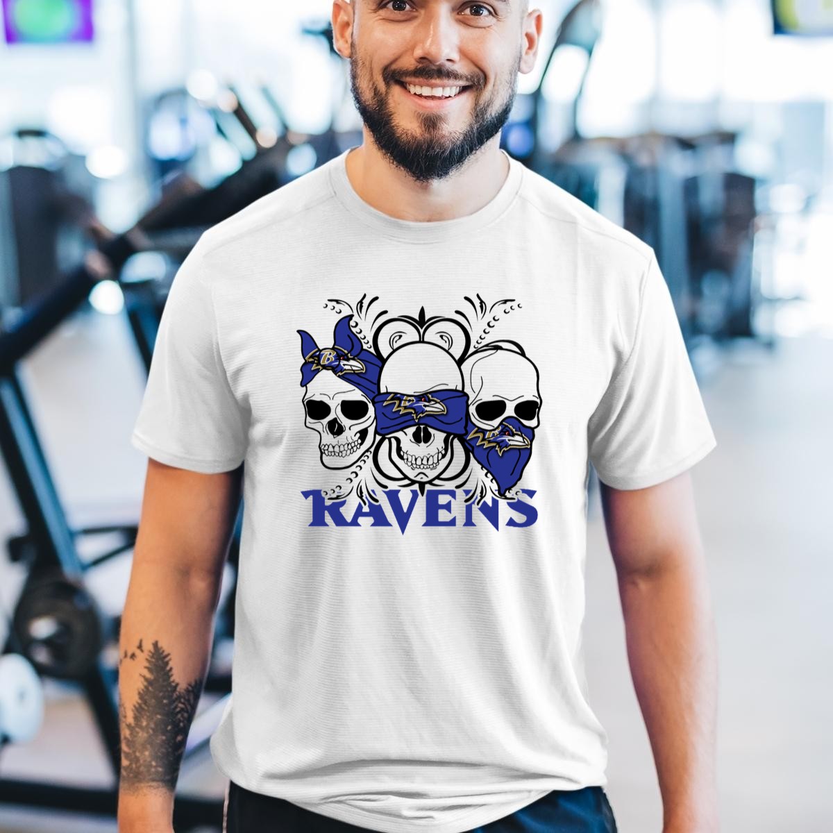 Show your team spirit with the Ravens Three Skulls Bandana T-Shirt, perfect for die-hard Baltimore Ravens fans! This unique design combines a striking skull motif with a classic bandana pattern, making it an eye-catching choice for any casual outing, themed events, or daily wear. Crafted for comfort and style, this shirt is a standout addition to your game day wardrobe, ensuring you represent your team with pride wherever you go.