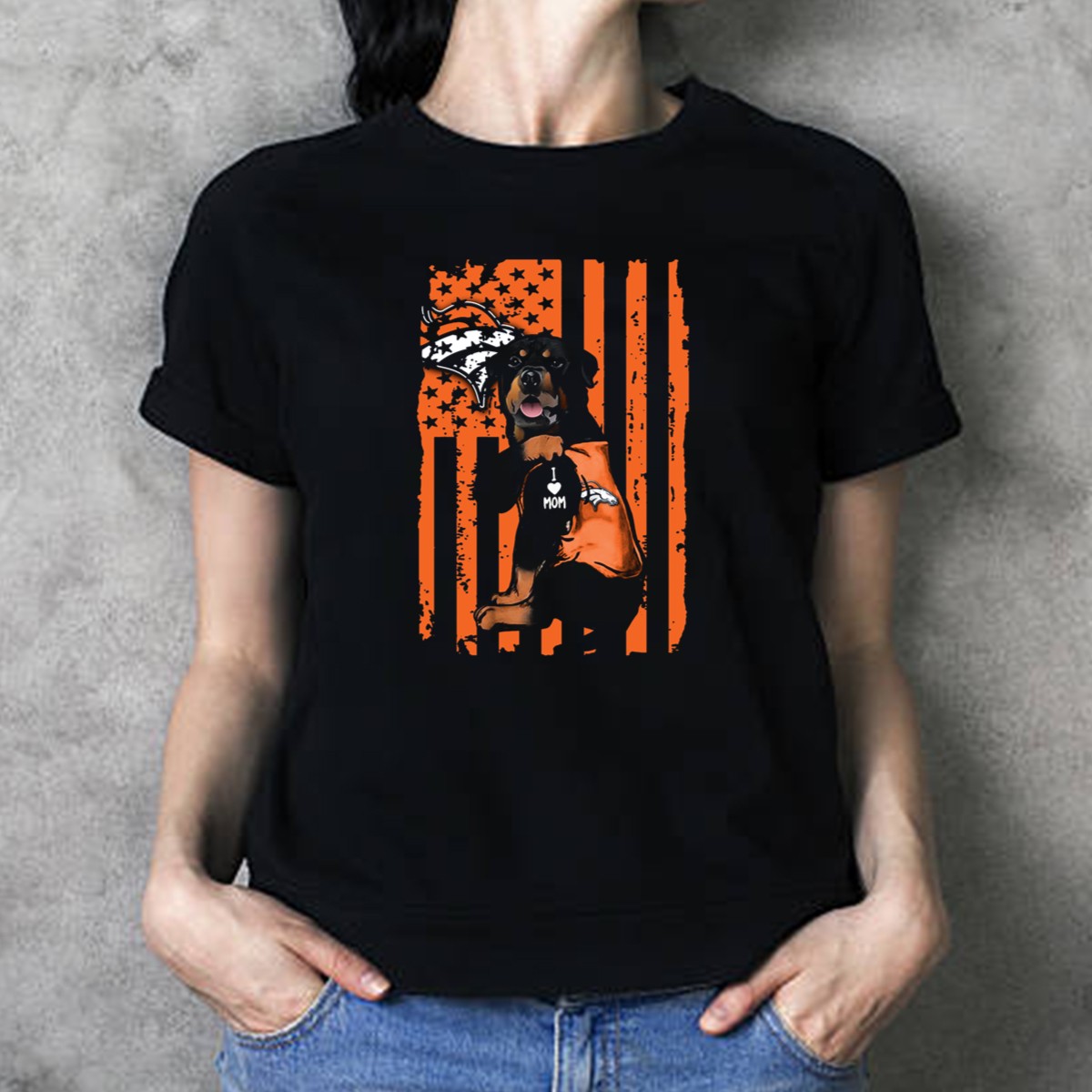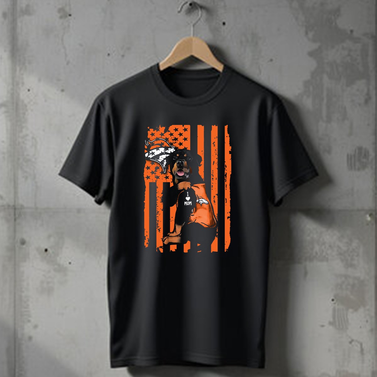 Show off your love for both your furry friend and your favorite team with our Rottweiler I Love Mom Denver Broncos USA Flag T-Shirt! Perfect for dog lovers and Broncos fans alike, this shirt combines comfort and style for any casual occasion. Whether you’re at a game, enjoying a themed event, or just out and about, this fan-made design printed in the USA is sure to turn heads and spark conversations.