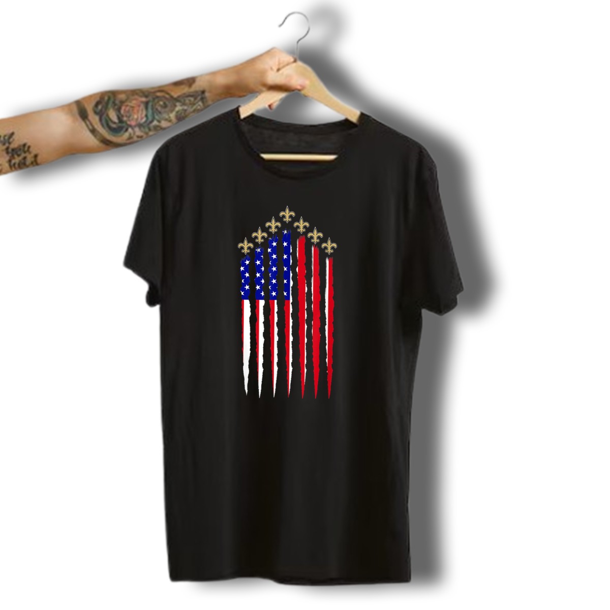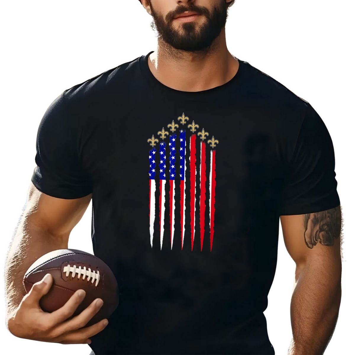 Celebrate your love for New Orleans football and the spirit of the 4th of July with our Saints Fleur De Lis American Flag T-shirt! This fan-made design is perfect for die-hard Saints supporters and anyone who wants to showcase their pride during themed events or casual outings. Crafted in the USA, this shirt combines comfort and style, making it an ideal choice for all-season wear.