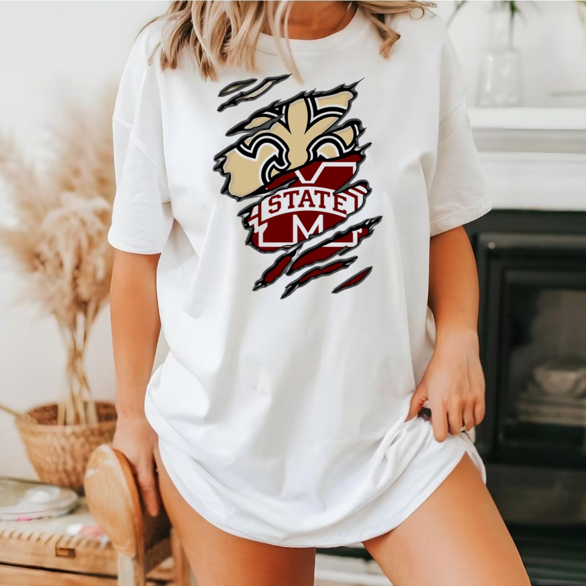 Show your unwavering support for the Mississippi State Bulldogs with this stylish fan-made T-shirt featuring the iconic Fleur De Lis logo combo. Perfect for spirited game days, casual outings, or themed events, this shirt combines comfort and style, making it an essential addition to any Bulldogs fan’s wardrobe. With its classic fit and soft, breathable fabric, you’ll feel great while proudly displaying your team pride.