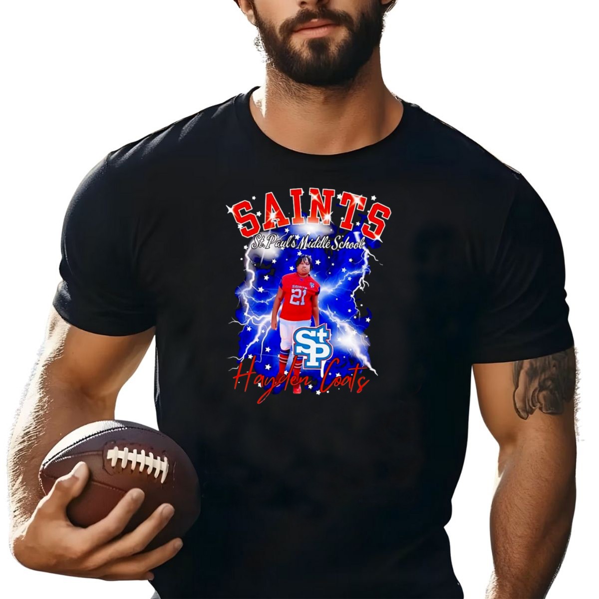 Show your school spirit with the Saints St Pauls Middle School Football Hayden Coats 21 Lightning Background T-Shirt! This eye-catching graphic tee is perfect for students, parents, and fans alike, designed for casual wear and themed events. With its unique fan-made design printed right here in the USA, this shirt is not just a piece of clothing; it’s a badge of pride for the Saints community.