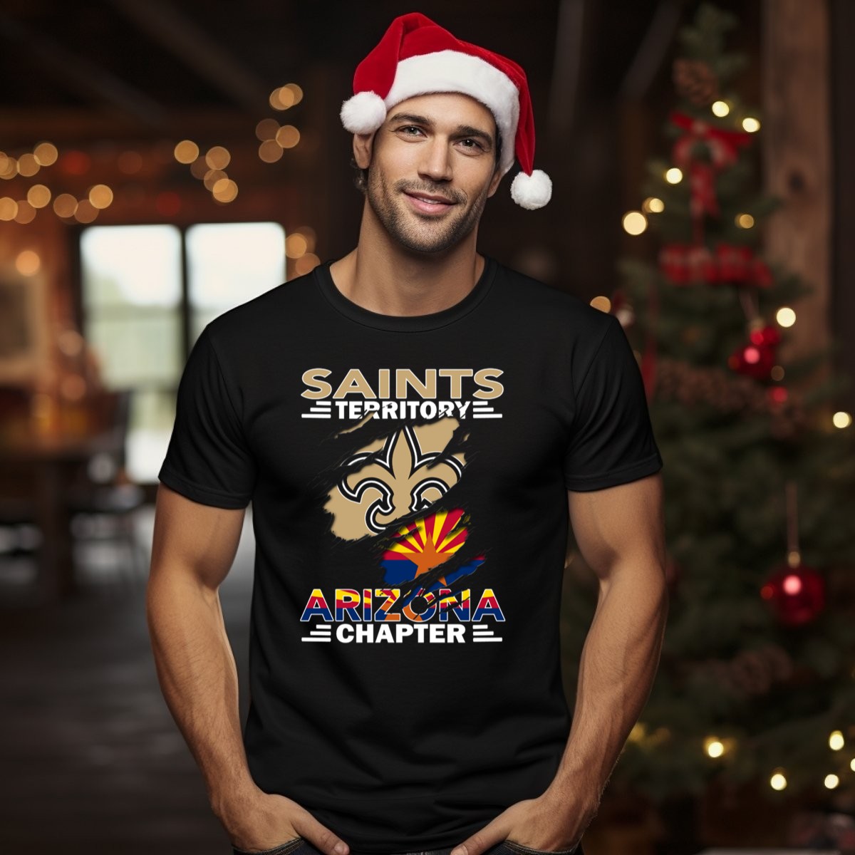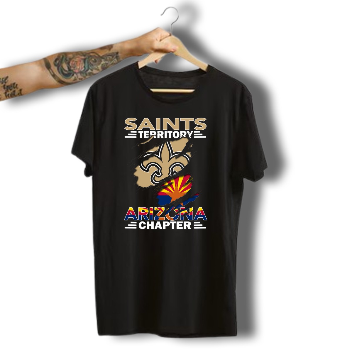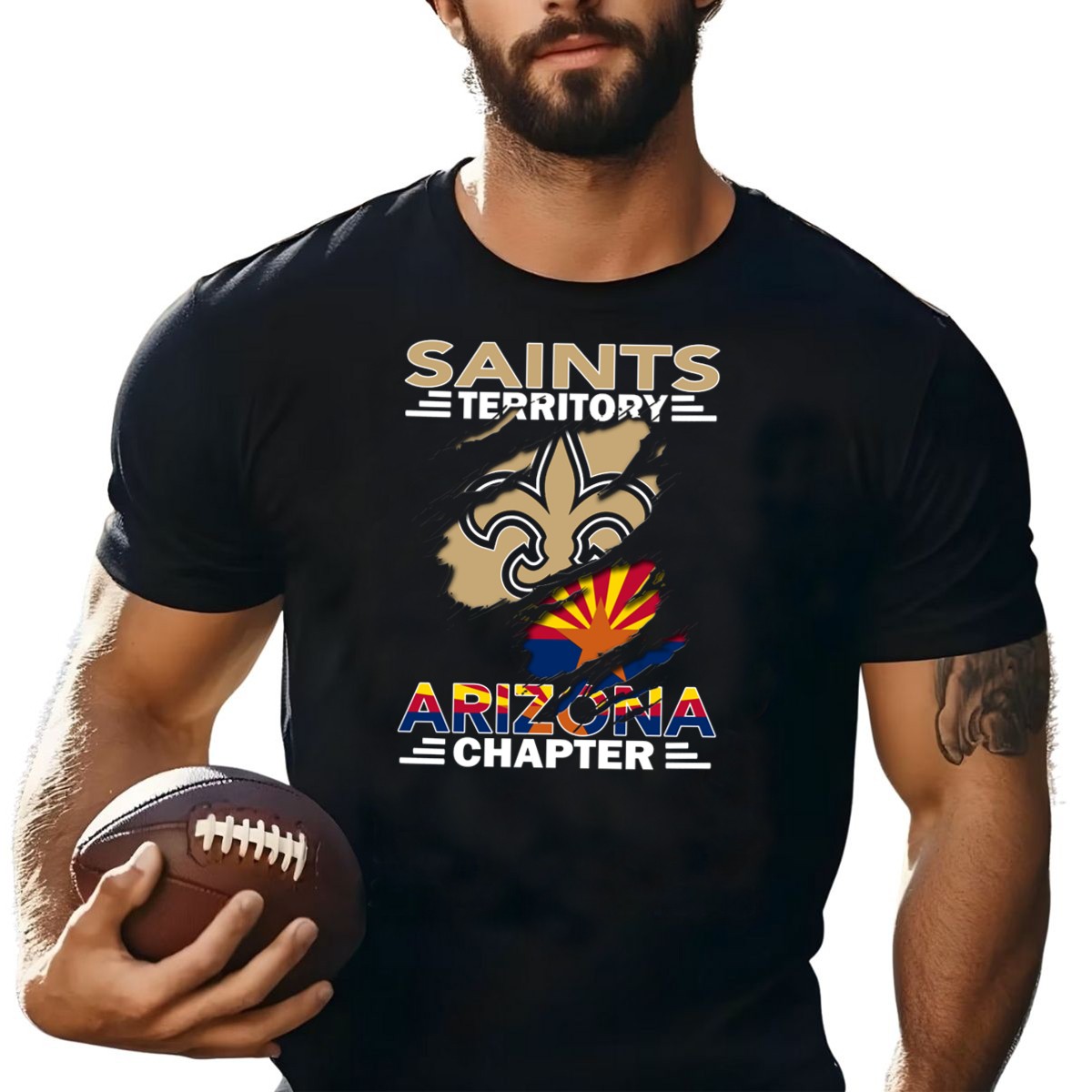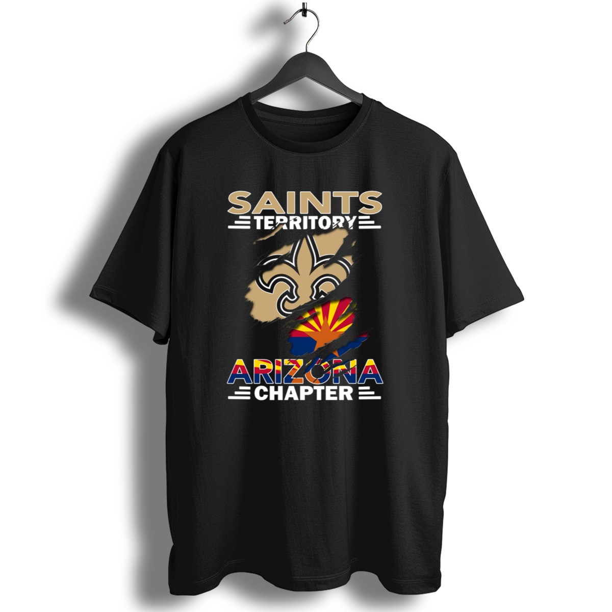 Embrace your pride for the Saints Territory Arizona Chapter with this unique Fleur De Lis and Arizona Flag T-shirt. Perfect for fans and supporters, this shirt is ideal for casual wear, themed events, or simply showcasing your love for Arizona. Crafted with a fan-made design printed in the USA, it combines style and comfort, making it a must-have addition to your wardrobe.