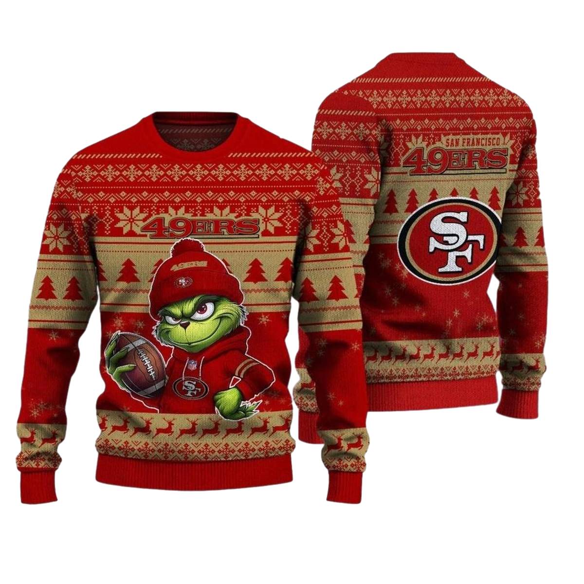 Get ready to spread some holiday cheer with our San Francisco 49ers The Grinch Ugly Sweater! Perfect for die-hard fans and holiday lovers alike, this sweater is ideal for festive gatherings, game day celebrations, or simply lounging at home with a cup of cocoa. Its playful design combines the spirit of Christmas with your favorite team, making it a unique addition to any winter wardrobe.