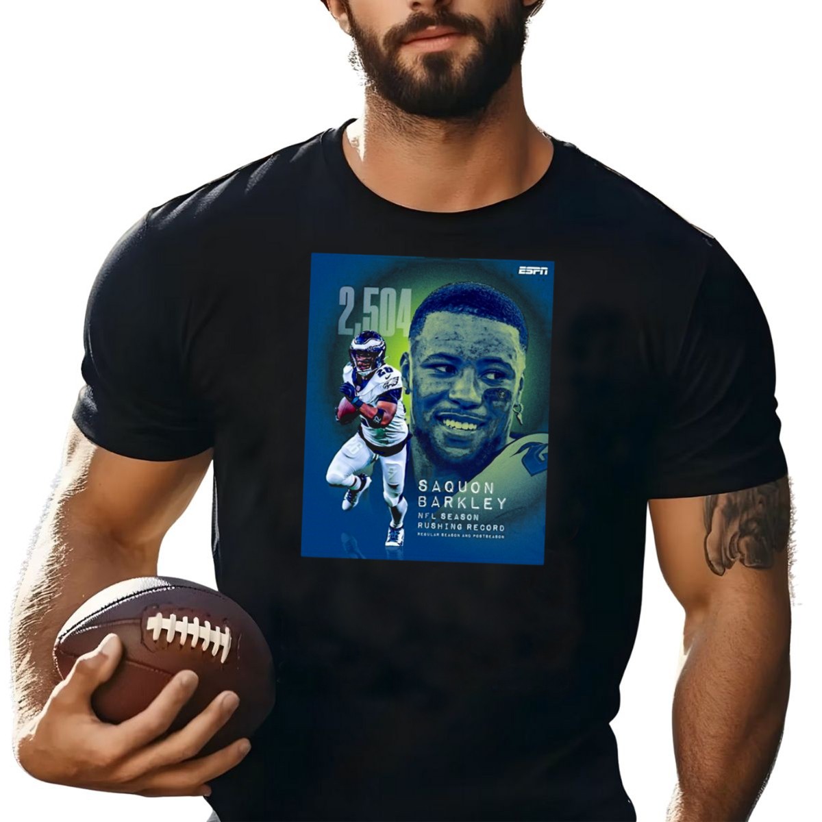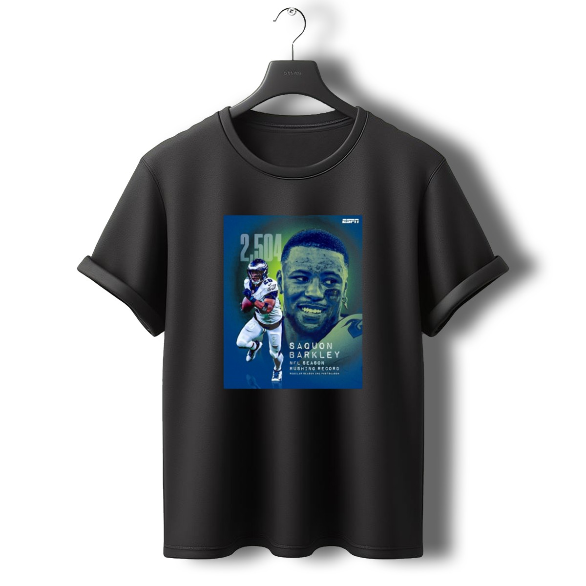 Celebrate the remarkable achievements of Saquon Barkley with this exclusive fan-made graphic T-shirt! Perfect for die-hard Philadelphia Eagles fans, this shirt showcases the iconic 2504 season rushing record, making it a must-have for game days, casual outings, or themed events. Crafted for comfort and style, this shirt not only commemorates a legendary player but also elevates your everyday wardrobe with its unique design, proudly printed in the USA.