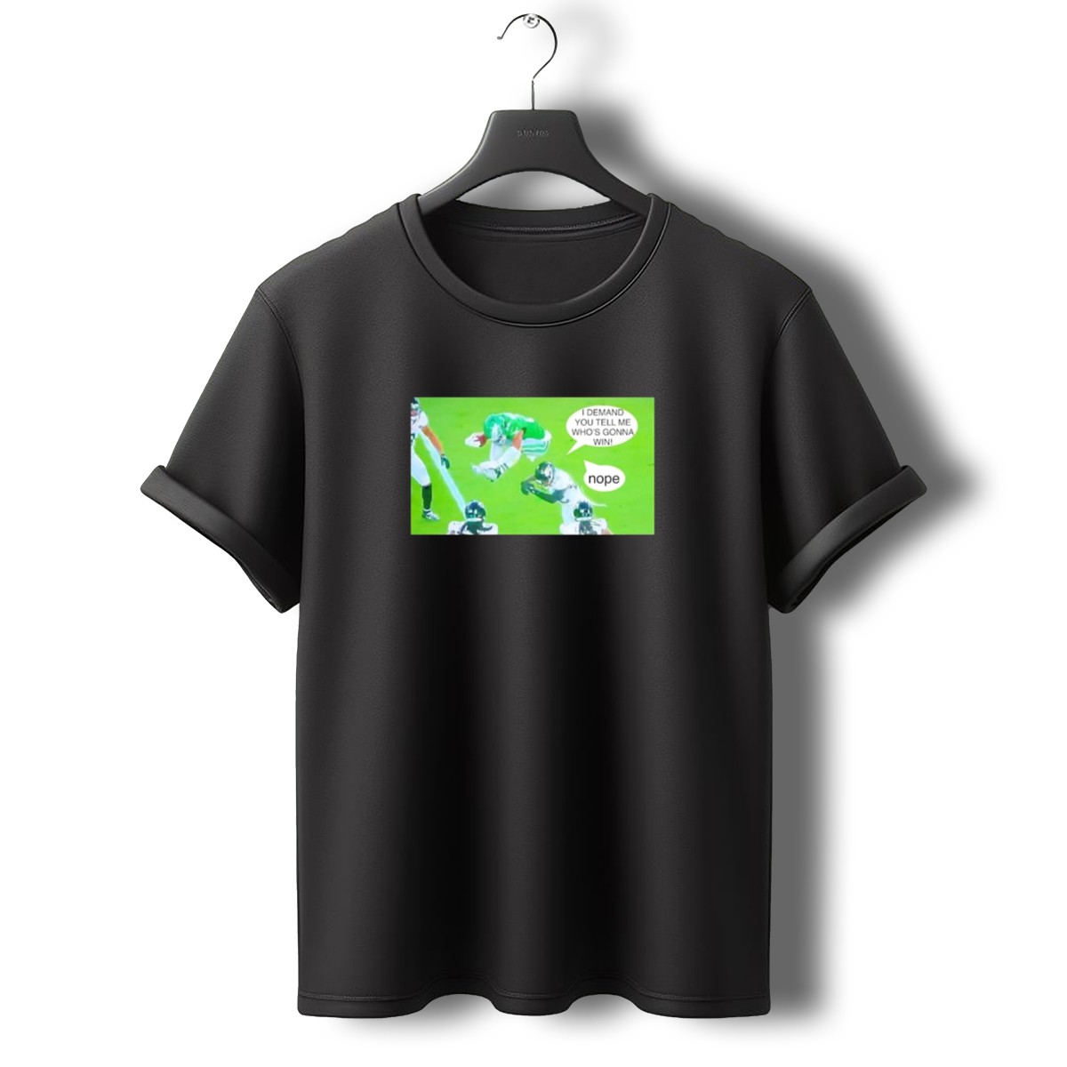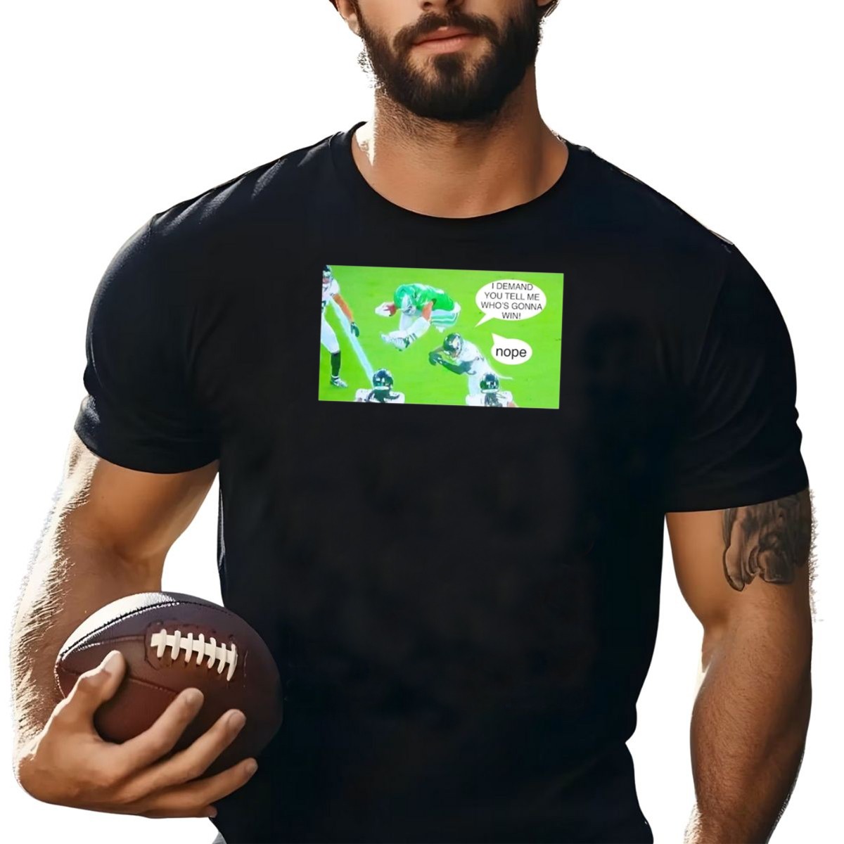 Show your unwavering support for Saquon Barkley and the Philadelphia Eagles with our “I Demand You Tell Me Who’s Gonna Win Nope” T-shirt! This fan-made design is perfect for devoted Eagles fans who want to make a statement during casual outings, themed events, or just daily wear. Crafted with comfort and style in mind, this shirt is a must-have for anyone looking to showcase their team spirit in a unique way.