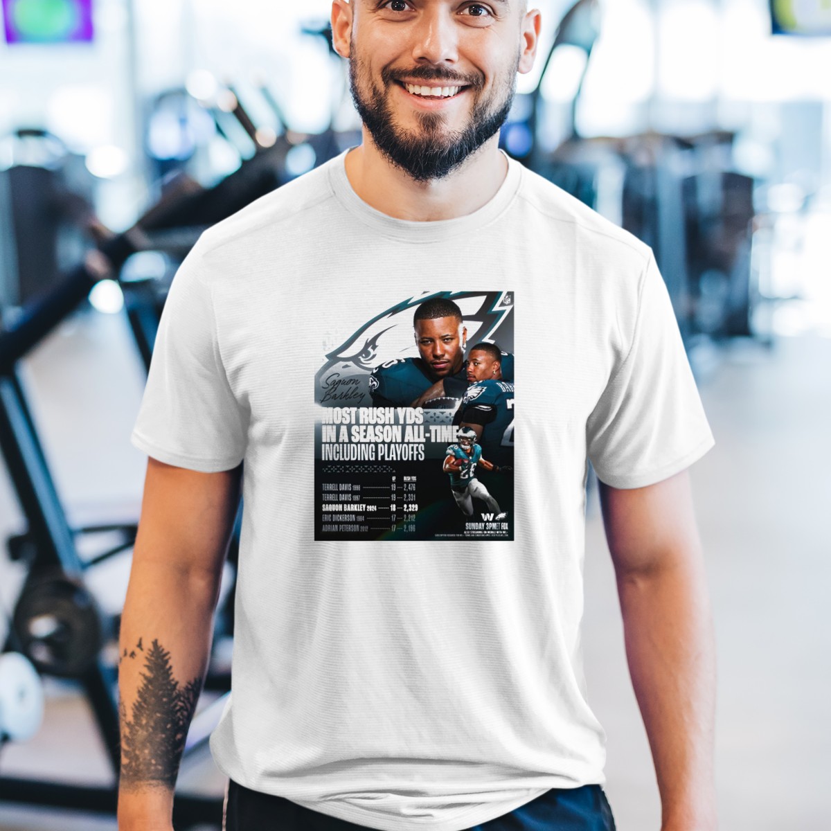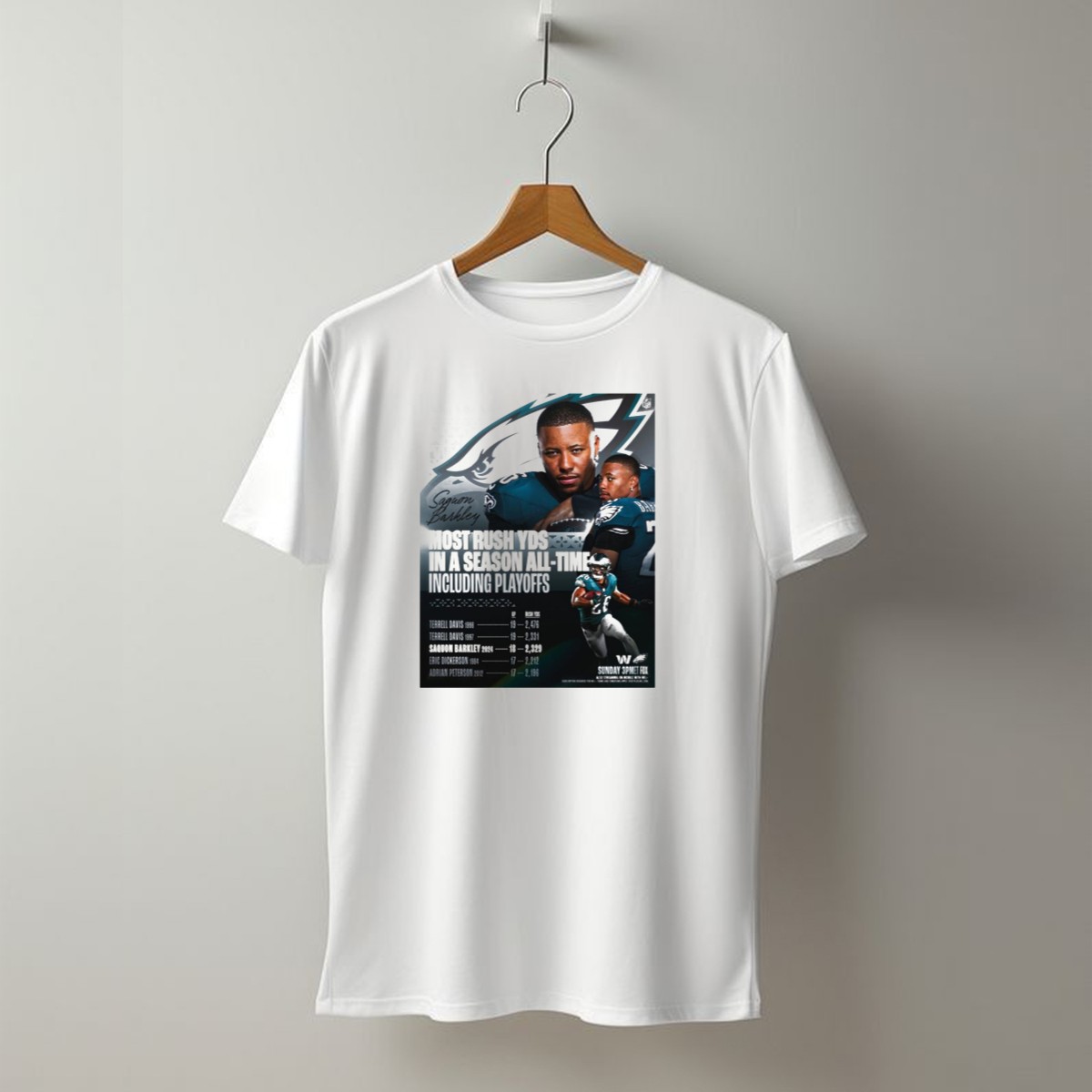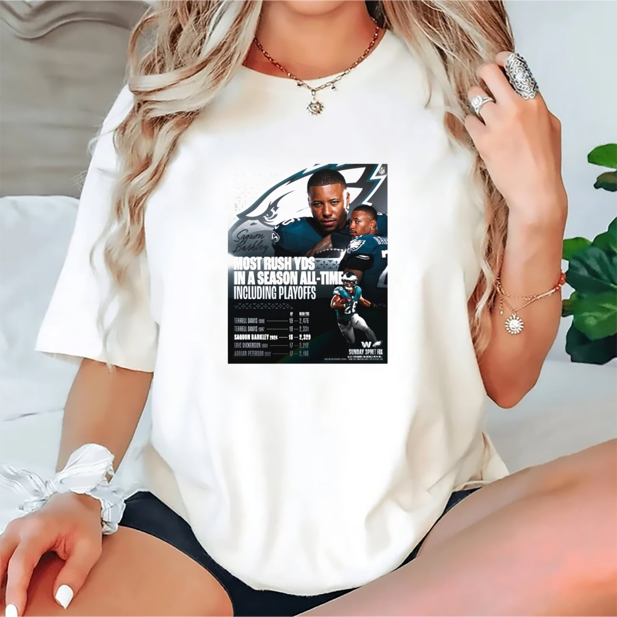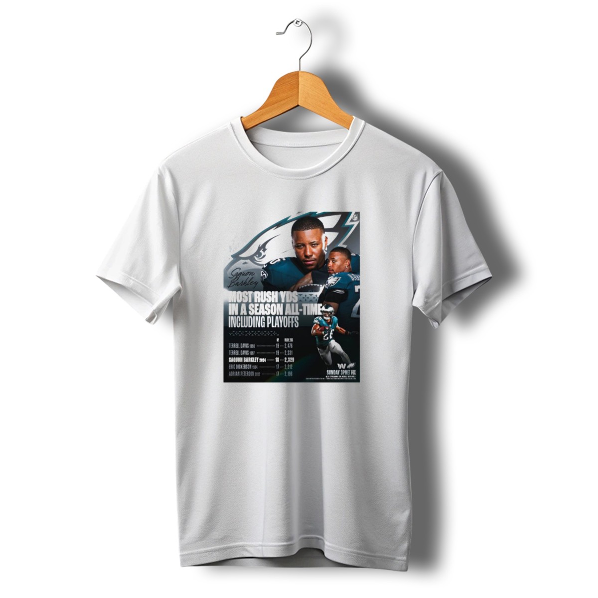 Celebrate the incredible achievement of Saquon Barkley with this fan-made graphic T-shirt, perfect for die-hard Philadelphia Eagles supporters. With its bold design commemorating the most rush yards in a season, including playoffs, this shirt is an ideal choice for casual outings, themed events, or simply showing off your team pride every day. Made with care and printed in the USA, it combines comfort with a timeless style that every fan will love.