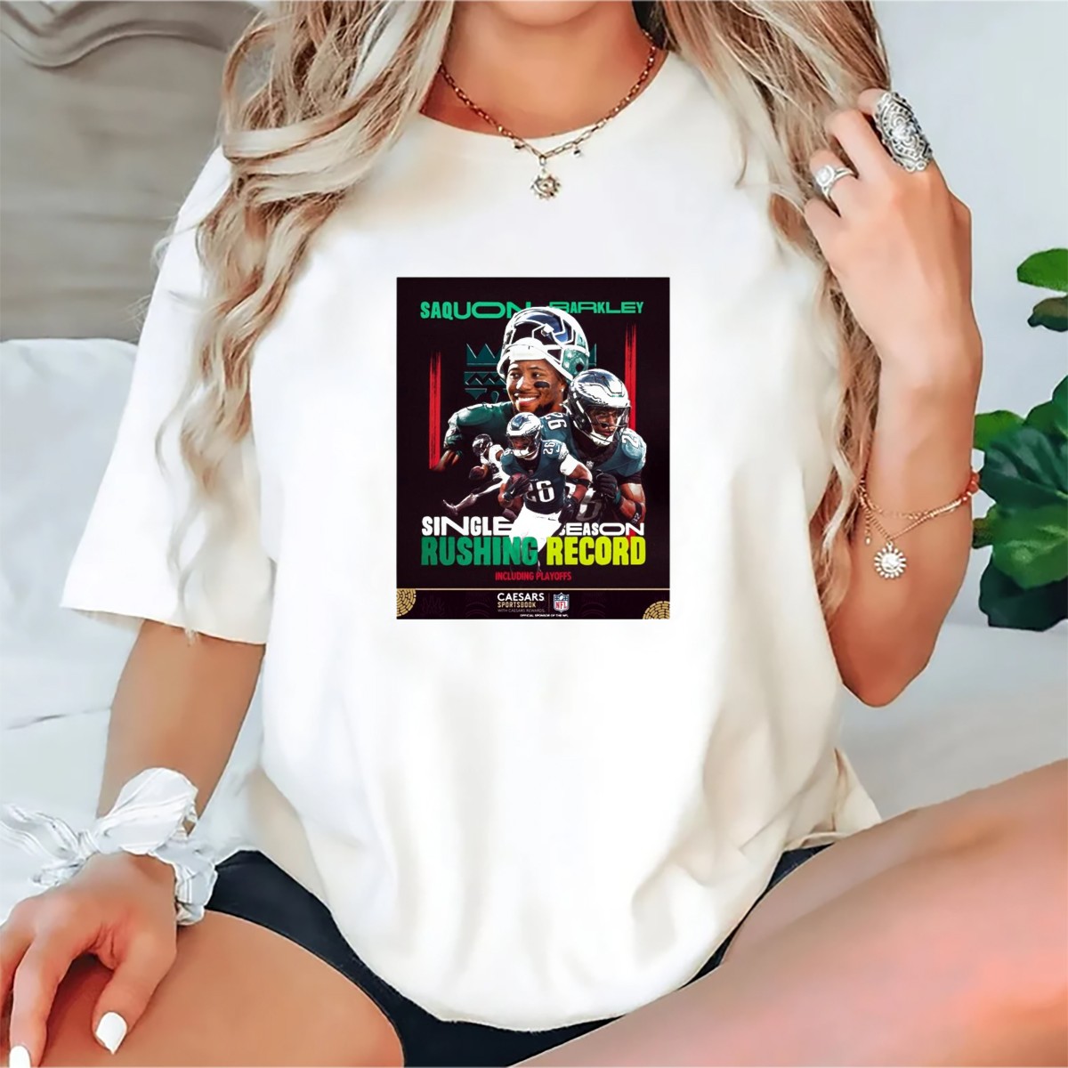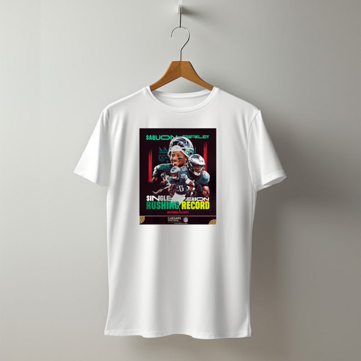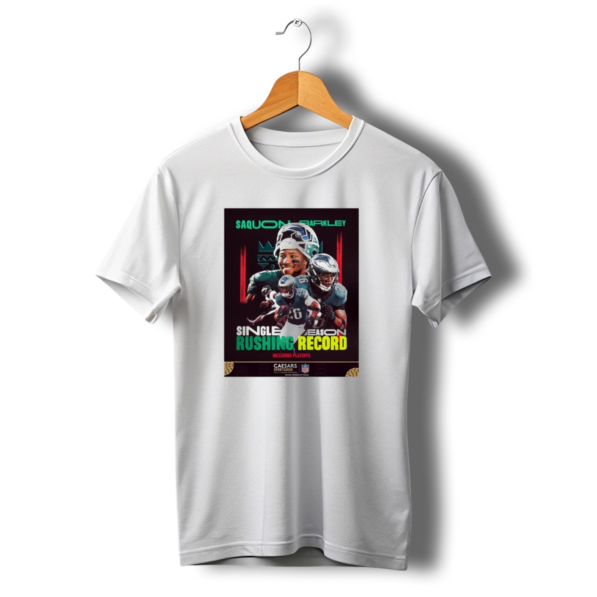 Celebrate the incredible achievement of Saquon Barkley with this fan-made T-shirt, perfect for die-hard Philadelphia Eagles supporters and football enthusiasts alike. Showcasing a unique design that commemorates his single-season rushing record, this shirt is ideal for casual outings, themed events, or simply lounging at home. Made with comfort in mind, it’s a great way to express your passion for the game while enjoying a soft and breathable fit.