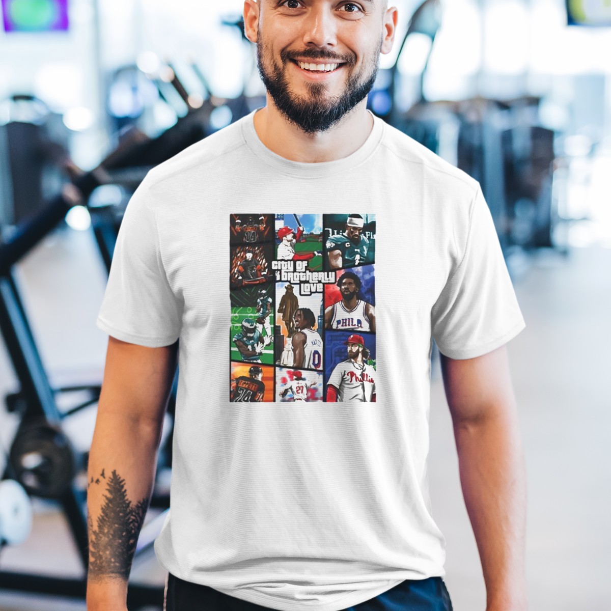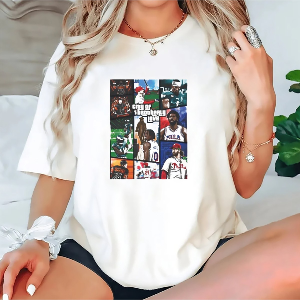 Show your love for Philly with the Saramart GTA x Philly Eagles Sixers Phillies City of Brotherly Love T-Shirt! Perfect for fans of the iconic Philadelphia teams, this shirt is designed for those who embrace their city’s vibrant sports culture. Whether you’re heading to a game, hanging out with friends, or just enjoying a casual day out, this fan-made design printed in the USA combines comfort and style, making it a must-have in your wardrobe.