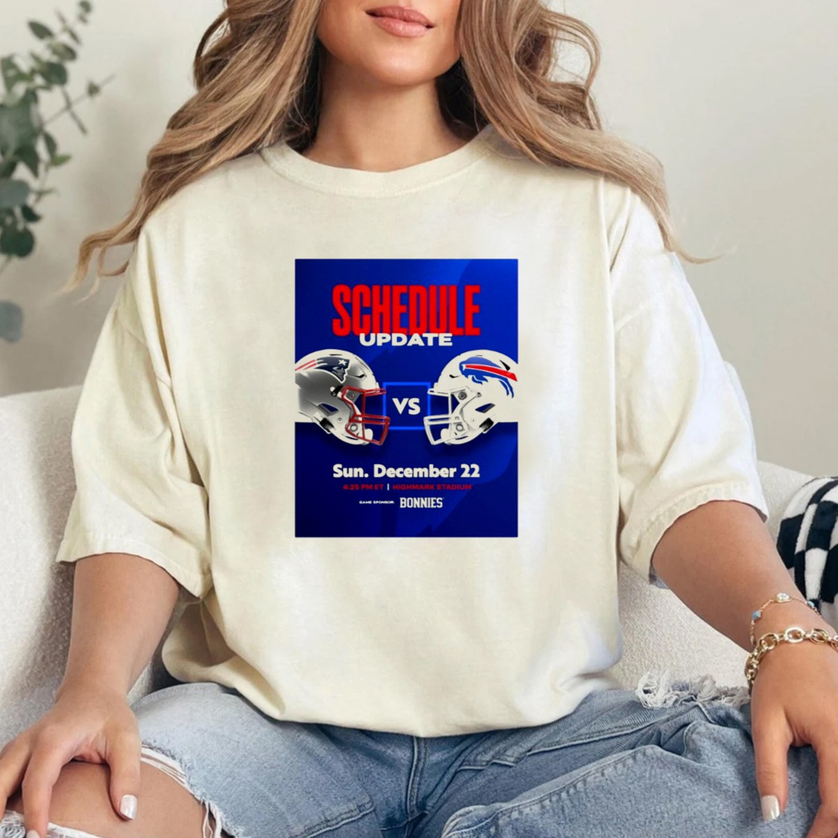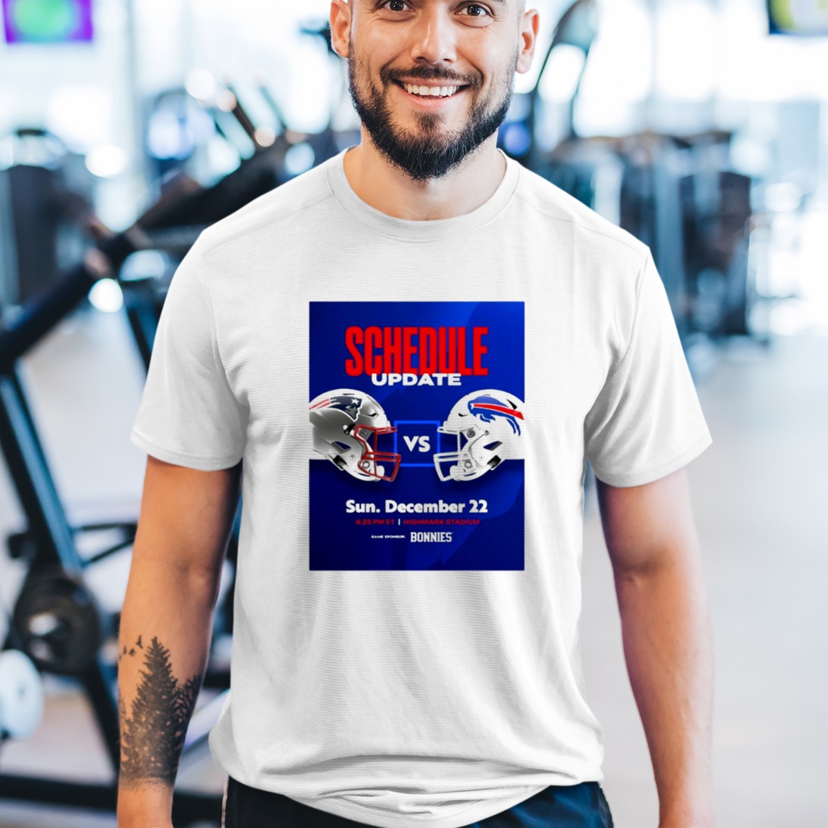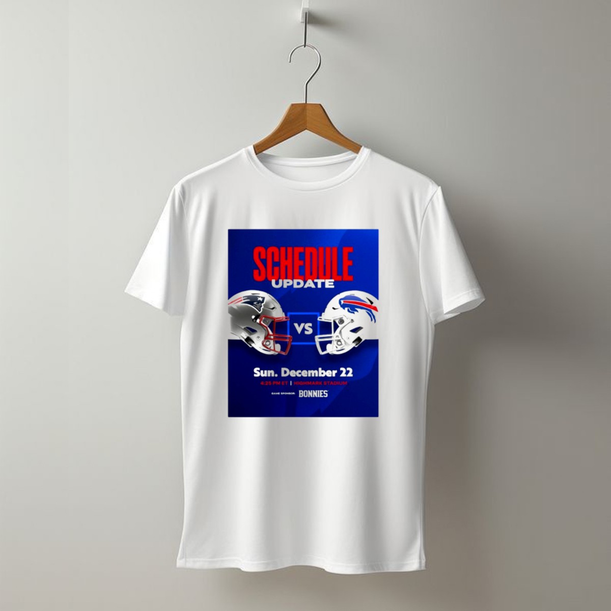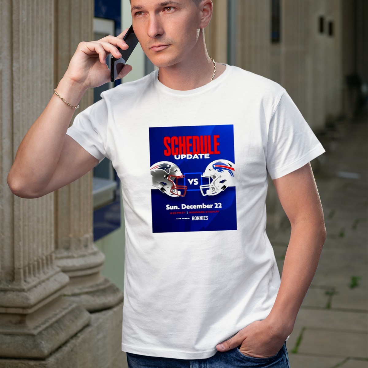 Celebrate your love for the game with our Schedule Update New England Patriots Vs Buffalo Bills T-Shirt! This fan-made design is perfect for die-hard football enthusiasts who want to showcase their team spirit during casual outings, themed events, or daily wear. Crafted with care and printed in the USA, this shirt combines comfort and style, making it a must-have for any Patriots or Bills fan looking to support their team in a unique way.