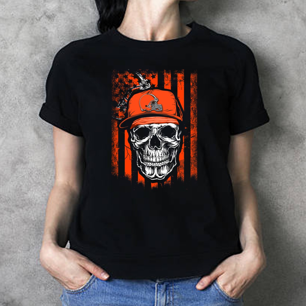 Skull in Cleveland Browns Helmet with Orange and Black Stripes T-Shirt