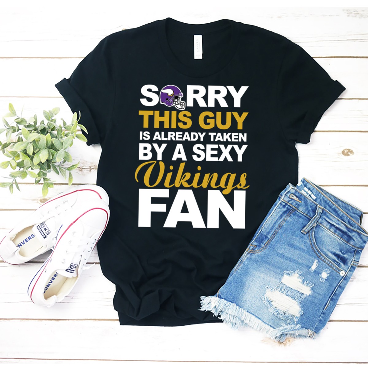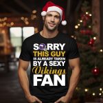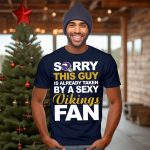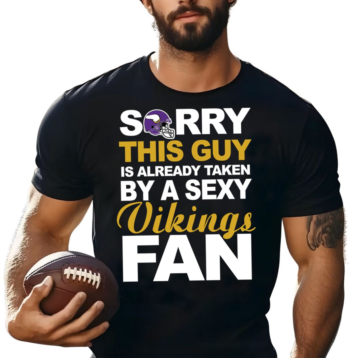 Show off your love for both your partner and the fierce spirit of Vikings fans with our “Sorry This Guy Is Already Taken By A Sexy Vikings Fan” T-shirt. Perfect for casual outings, themed events, or just lounging at home, this shirt is designed for those who embrace their team spirit with humor and style. Crafted with a fan-made design and proudly printed in the USA, it’s a unique addition to any Vikings fan’s wardrobe.