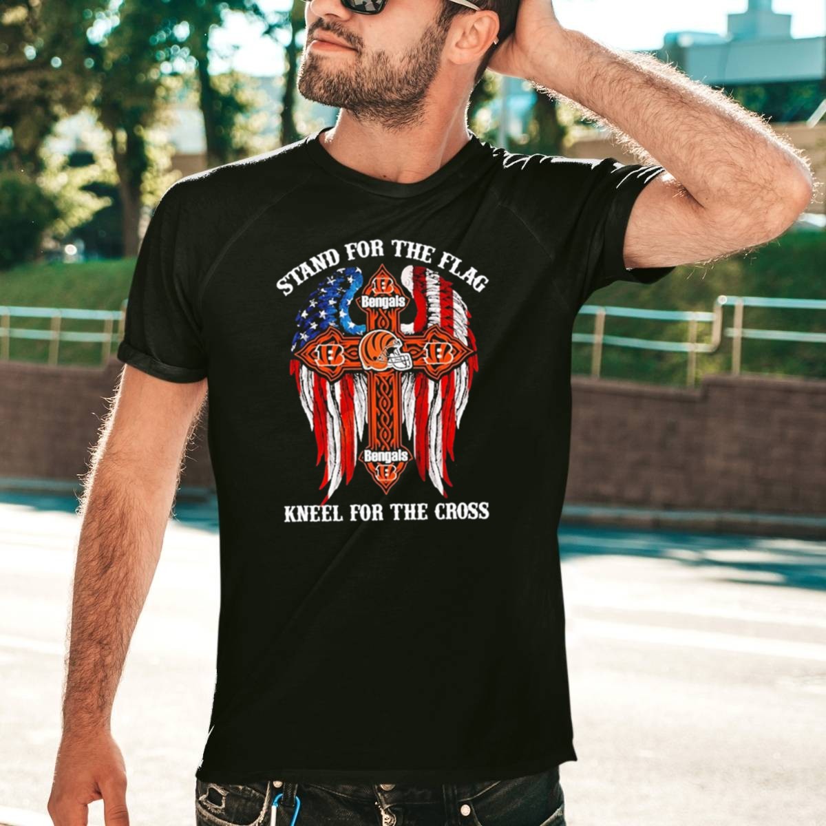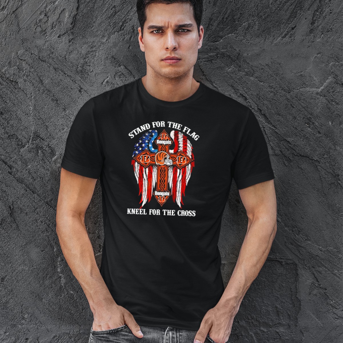 Show your unwavering support for your team and your faith with the “Stand For The Flag Kneel For The Cross” T-shirt, designed especially for Cincinnati Bengals fans. This classic fit unisex tee is perfect for casual outings, themed events, or daily wear, making it a versatile addition to your wardrobe. Crafted with a fan-made design printed in the USA, this shirt embodies the spirit of unity and pride, allowing you to express your values in style.
