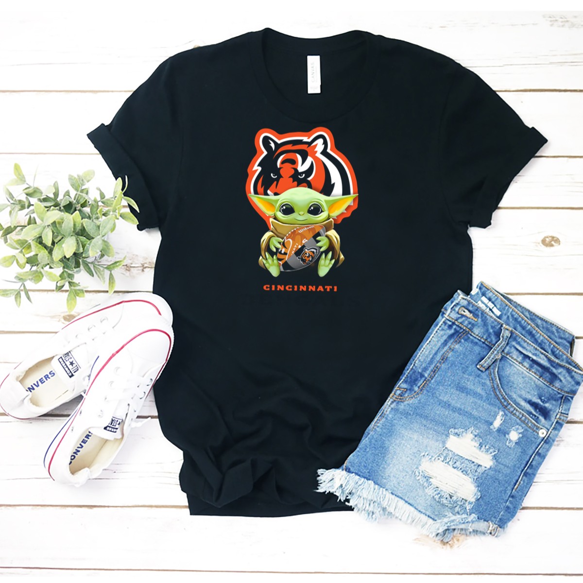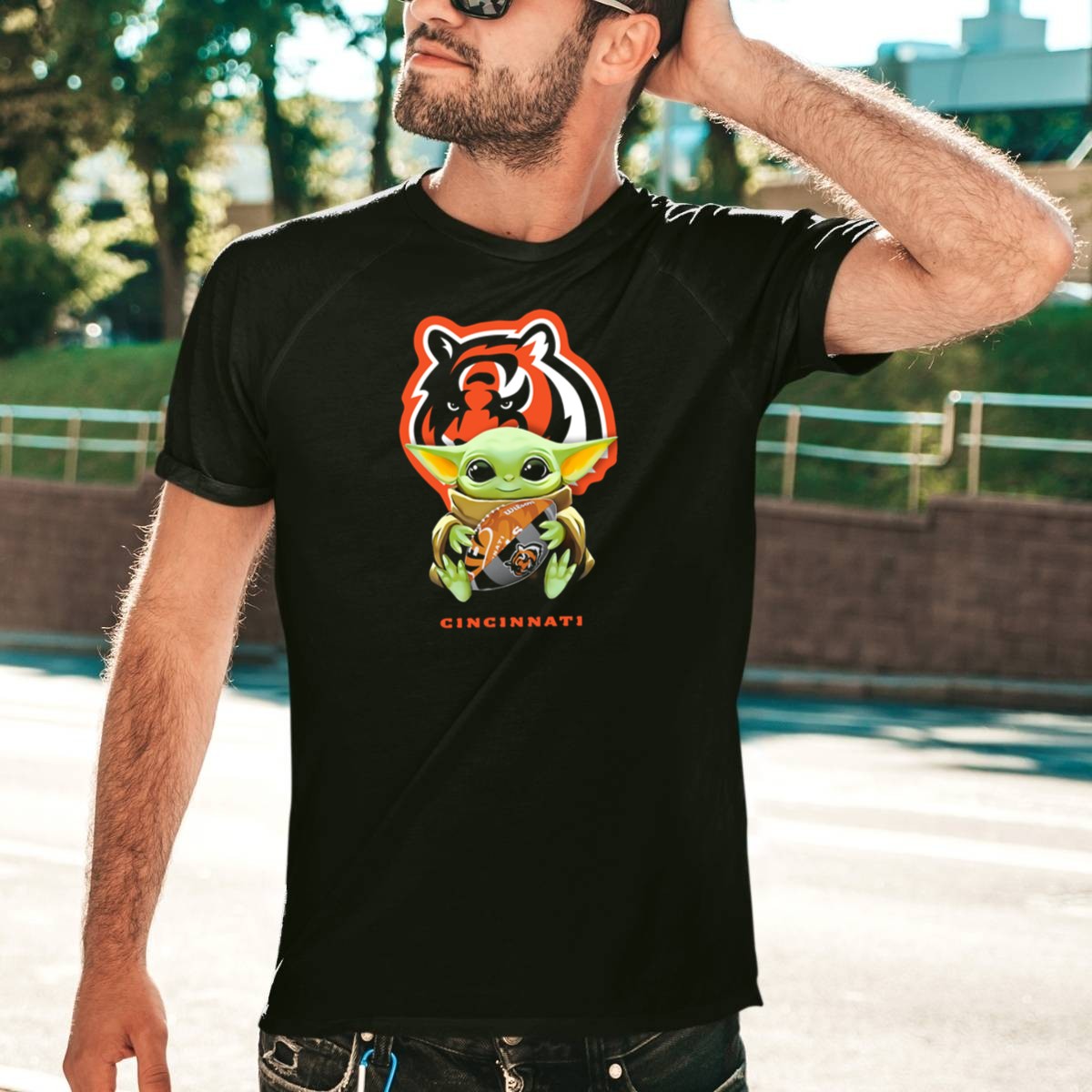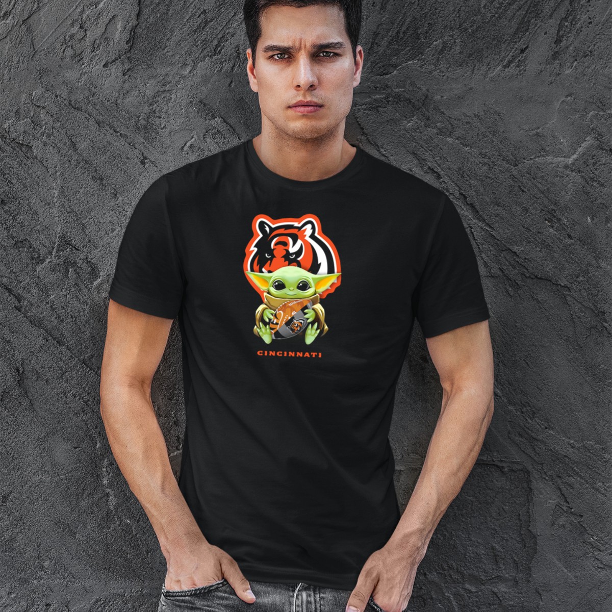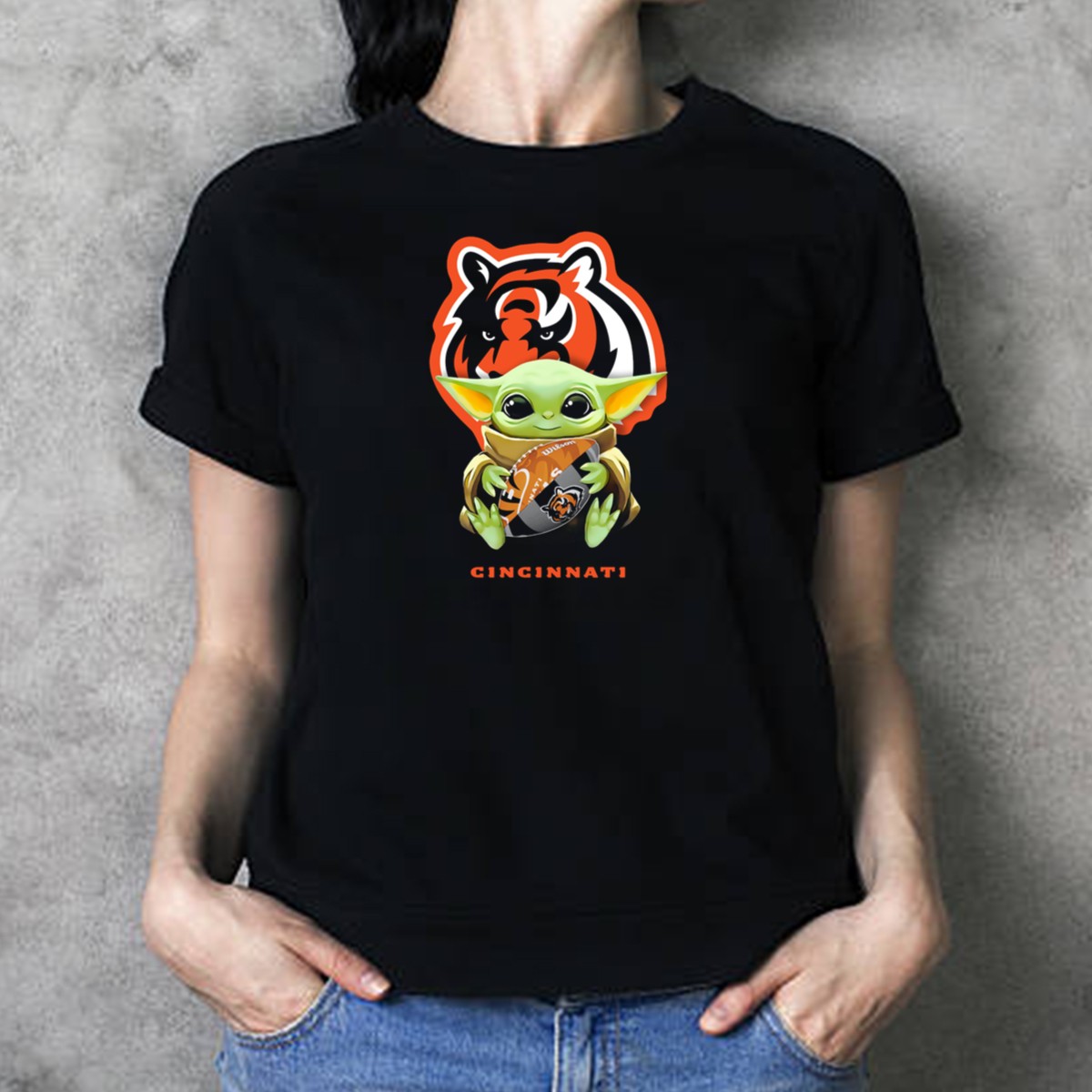 Star Wars Baby Yoda Hugging Cincinnati Bengals Logo Football T-Shirt