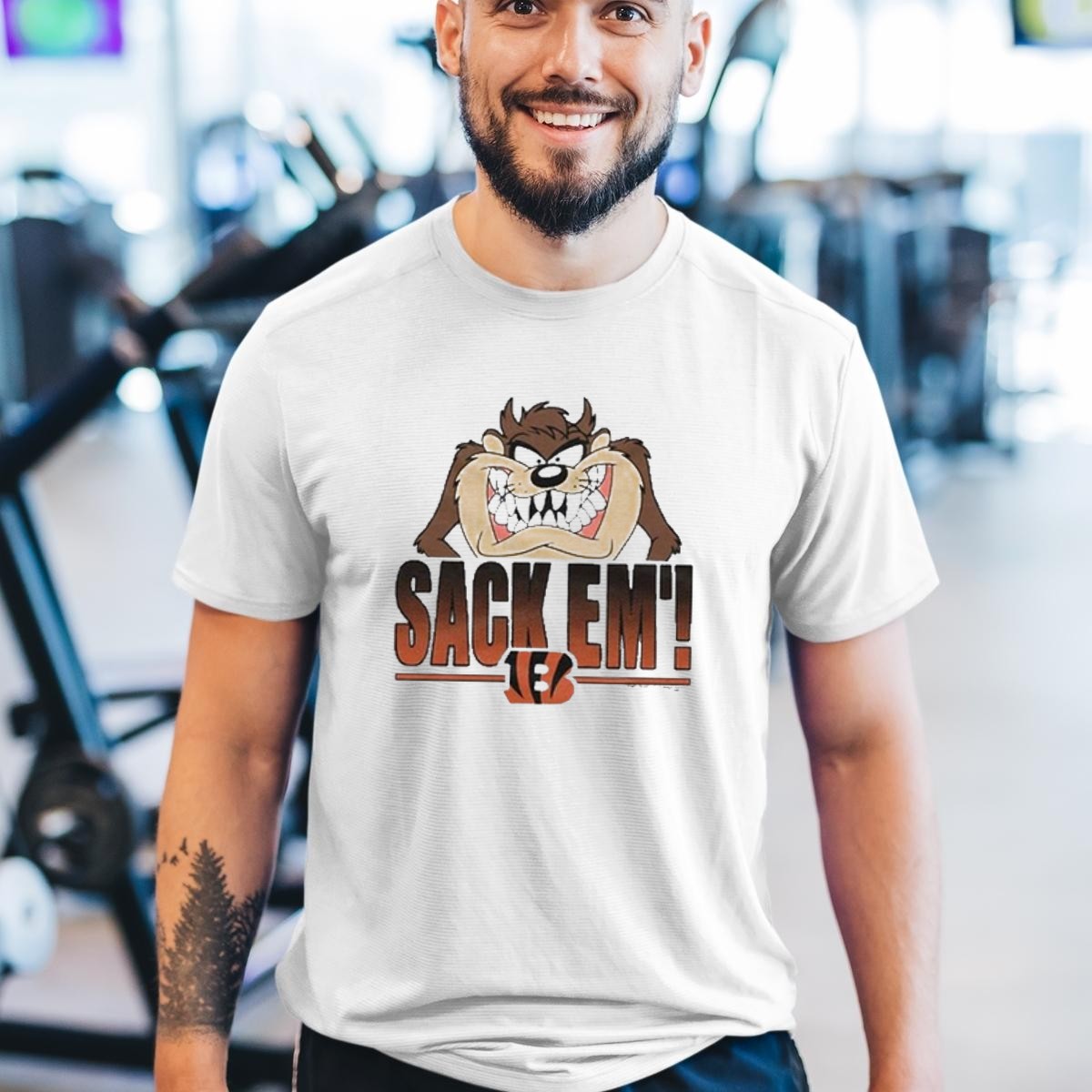 Show off your love for the Cincinnati Bengals with our Taz Sack Em Looney Tunes collaboration T-shirt! This fan-made design merges classic cartoon fun with team spirit, making it the perfect addition to any casual wardrobe. Whether you’re heading to a game, a themed event, or just hanging out with friends, this shirt is sure to turn heads and spark conversations. Made in the USA, it combines comfort and style for the ultimate fan experience.