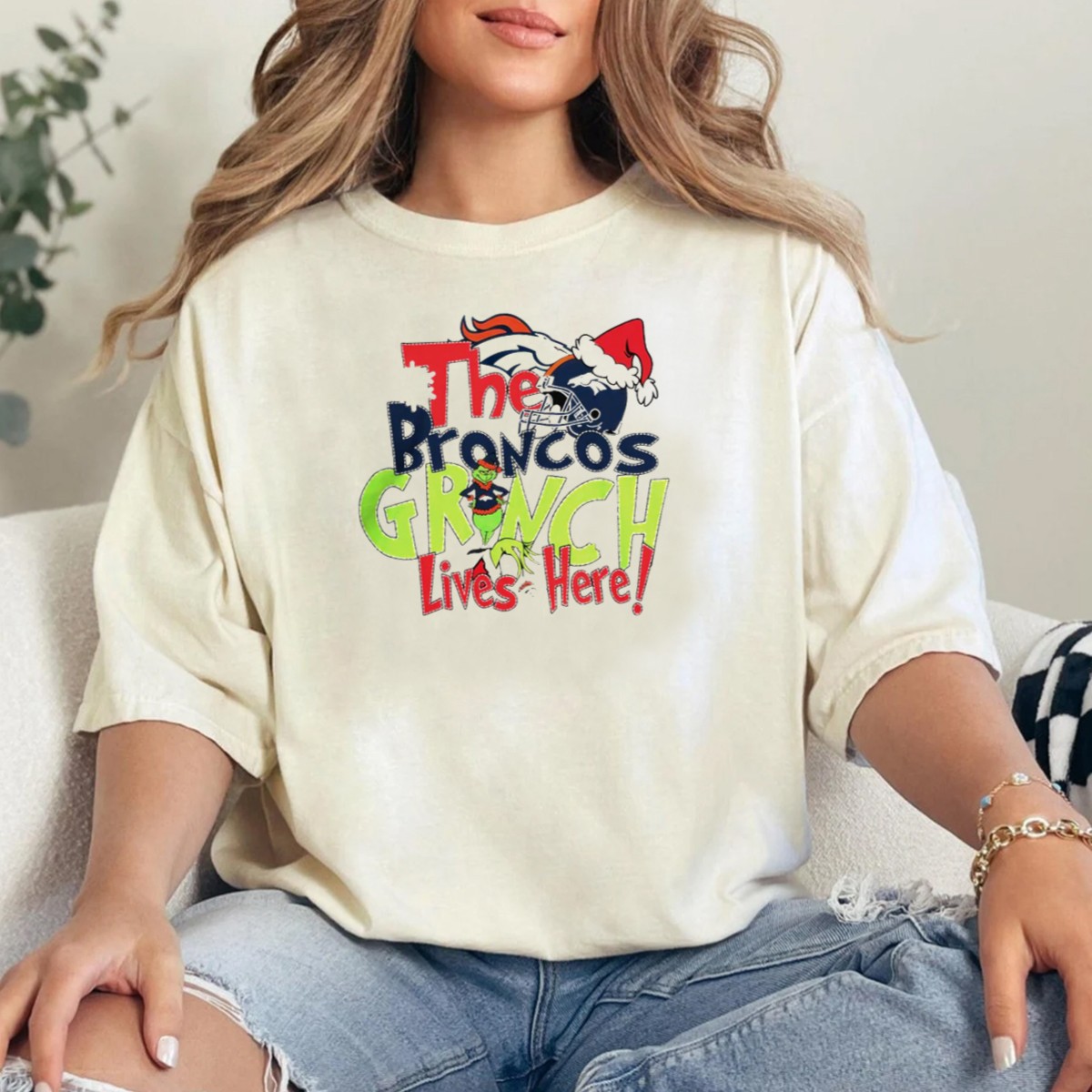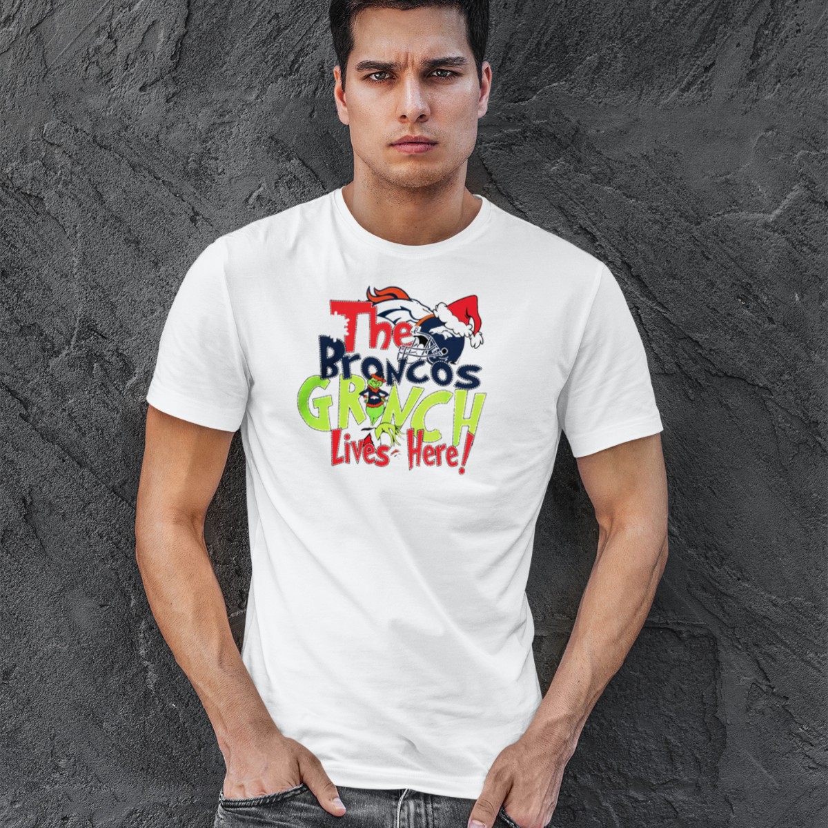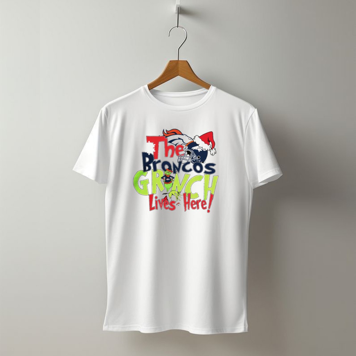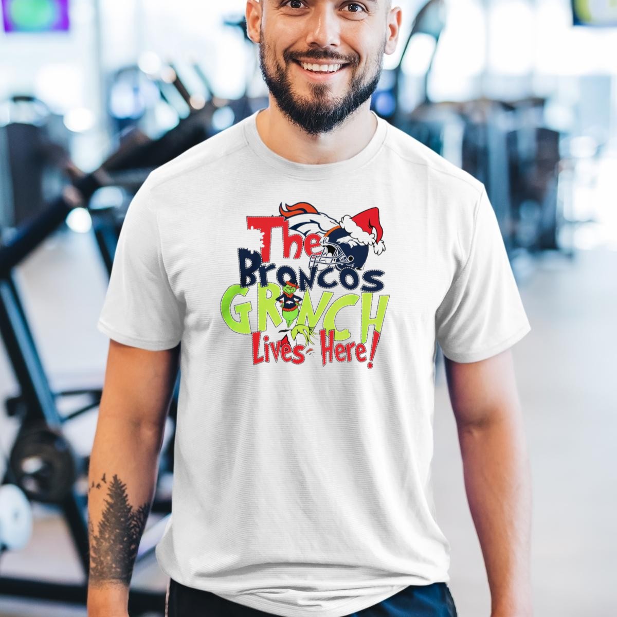 The Broncos Grinch Lives Here Christmas Denver Broncos Santa Hat Helmet T-Shirt