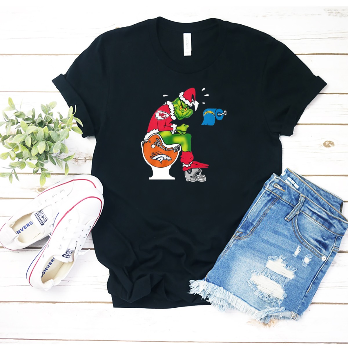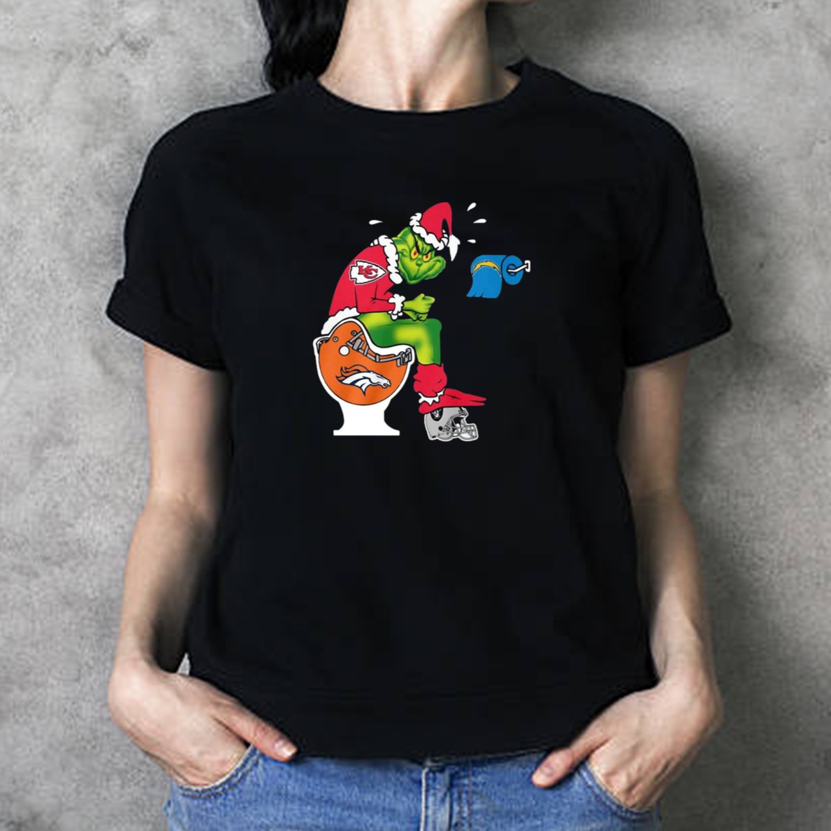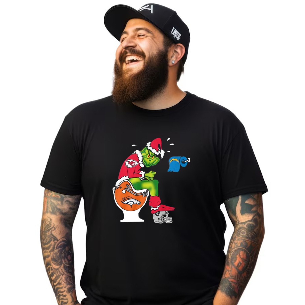 Celebrate the holiday season with our playful “The Grinch on Toilet” T-shirt, perfect for passionate NFL fans and holiday enthusiasts alike! This fan-made design combines the whimsical charm of the Grinch with the spirited rivalry of the Kansas City Chiefs, Denver Broncos, Oakland Raiders, and Chargers. Ideal for casual outings, themed events, or simply lounging at home, this shirt adds a fun twist to your holiday wardrobe while showcasing your love for football. Made with care in the USA, it’s a must-have for anyone looking to spread some festive cheer!